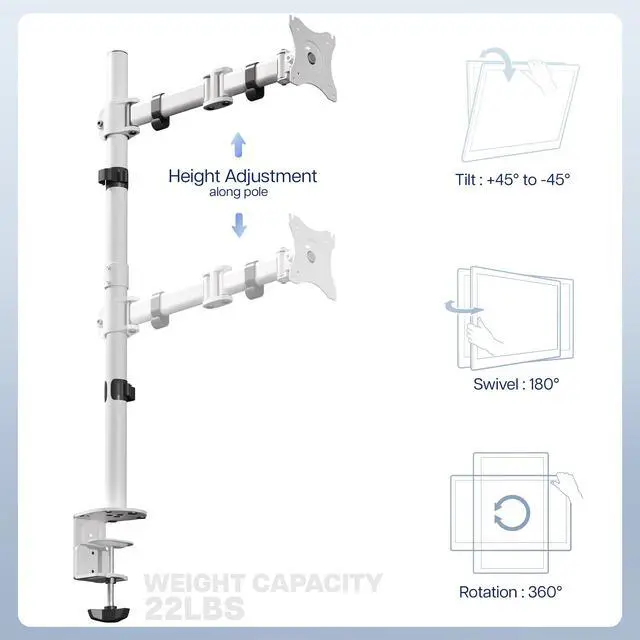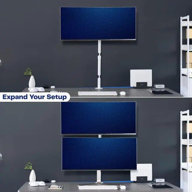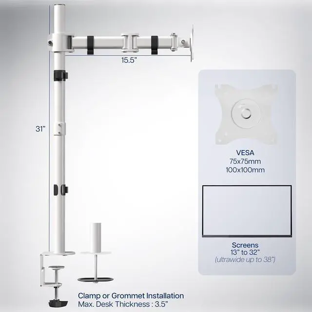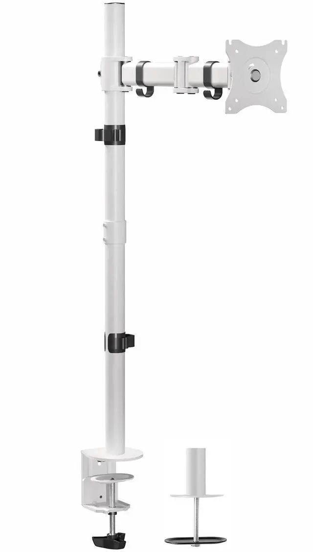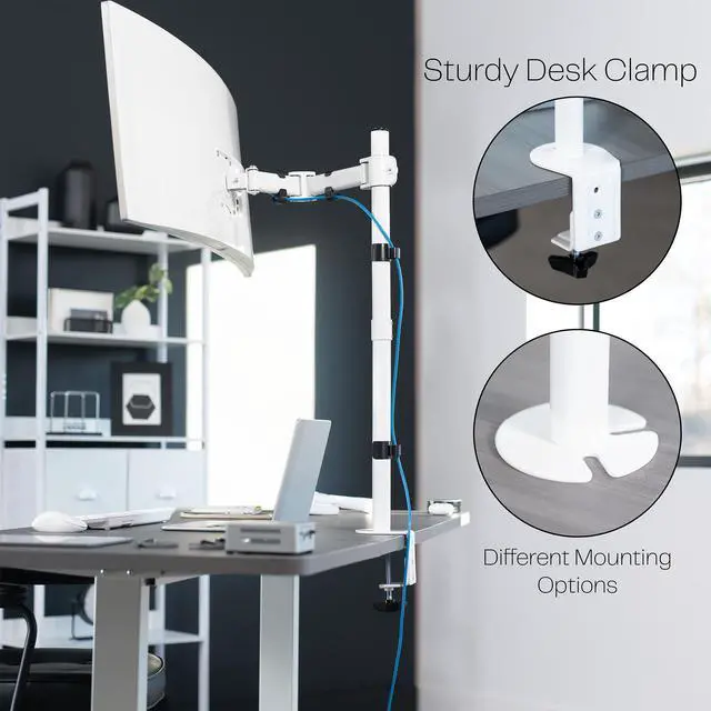 Enhance your visual display with the White Single Monitor Extra Tall Desk Mount (STAND-V001TW) from VIVO! Clear up valuable workspace on your desk with this tall monitor stand. Constructed of high-grade steel, and finished in white, this rugged mount was built to resist scratches and support screens up to 22 lbs and 32 in size (Fits ultrawide monitors up to 38" if under 22 lbs). STAND-V001TW offers a variety of features including an extra tall 31" center pole with easy height adjustment, articulation for your screen, and 5 adjustable joint points, all allowing you to create optimal viewing angles. Tighten or loosen each joint to make your mount as fluid or stationary as desired.