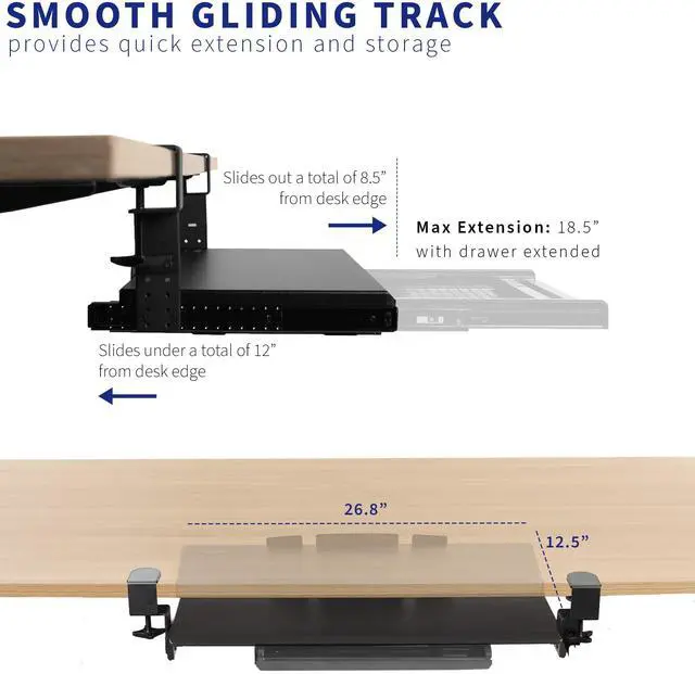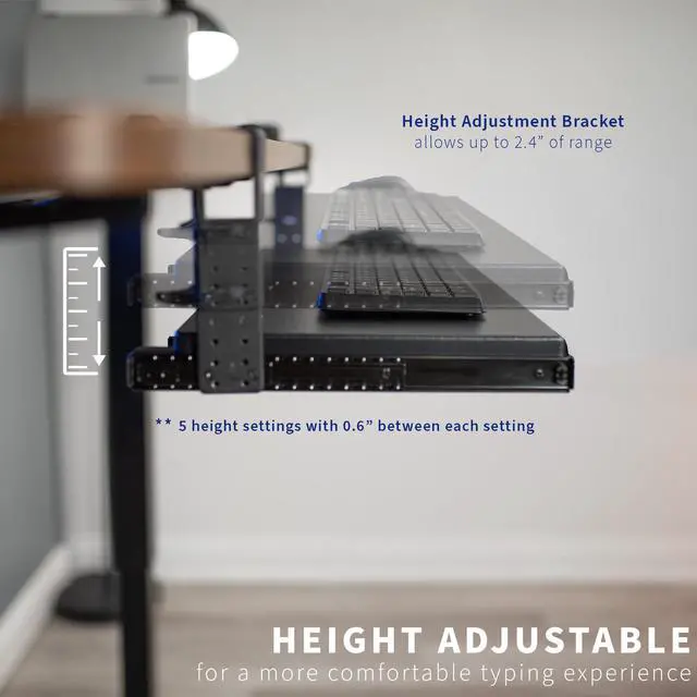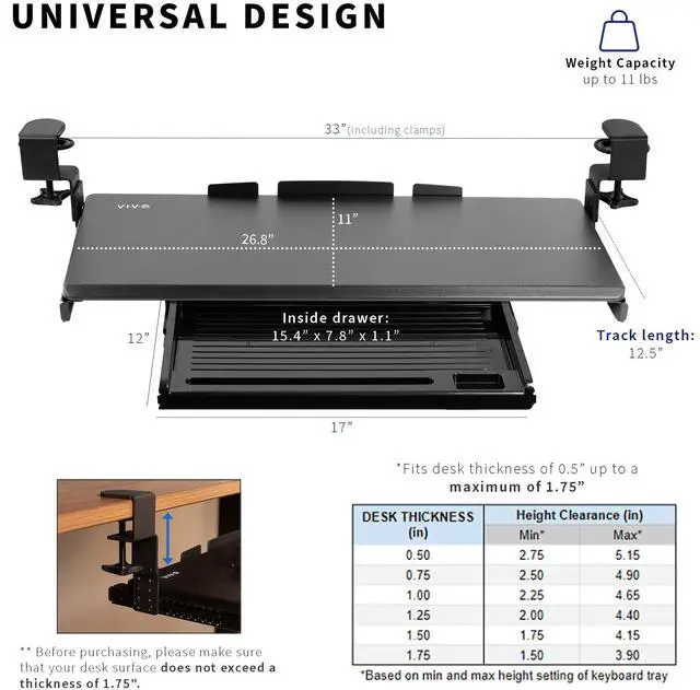 Enjoy the benefits of an organized work space and increased ergonomics with Clamp-on Height Adjustable Keyboard Tray with Pencil Drawer (MOUNT-KB05-4DH) from VIVO! Win back valuable desk space by adding a lower-tier surface for the keyboard, mouse, and other small items. Designed with user-geared features such as smooth gliding motion for easy placement, height adjustable C-clamps for convenient mounting, and anti-skid padding for scratch resistance, this mount was built to perform! The solid steel track construction makes this mount extra sturdy and guaranteed to last. The under-desk tray placement creates an ergonomic setup that decreases fatigue and muscle strain on the neck, back, and shoulders. The sleek, black appearance adds a classy look to any office while providing ample support for your keyboard and accessories. All hardware is provided for easy installation to get your tray mounted and organized in no time!