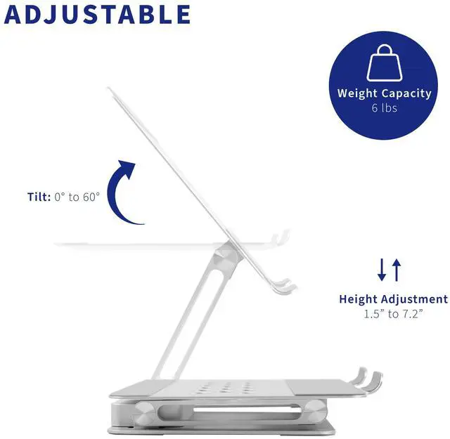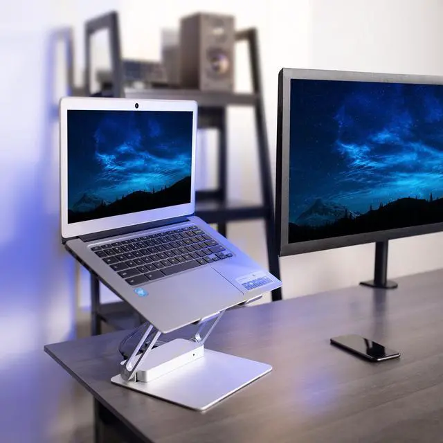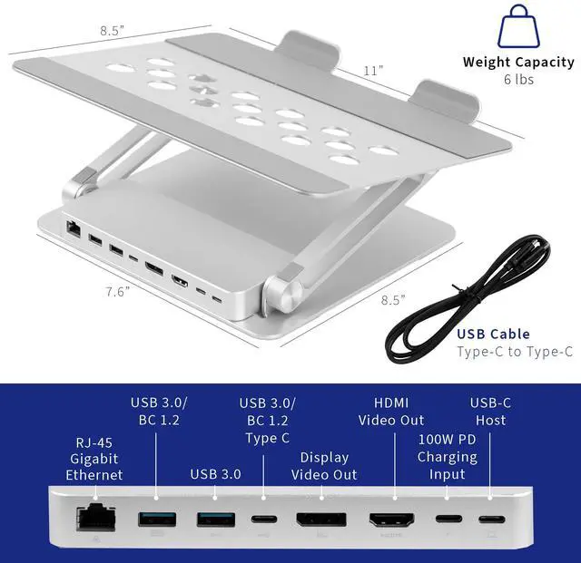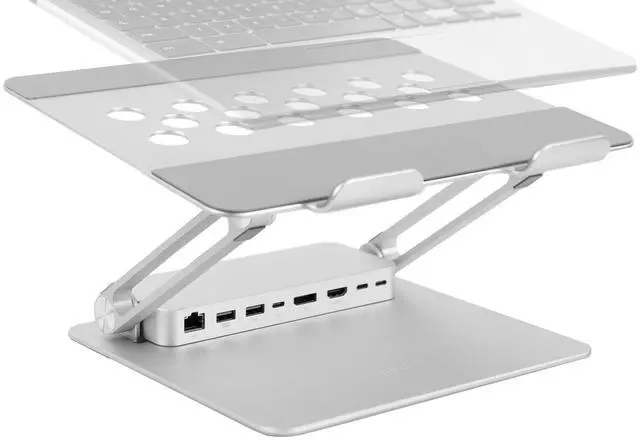 Raise your laptop to a comfortable height and conveniently charge your devices with the Aluminum Laptop Riser Docking Station (STAND-V000LD) from VIVO! This sleek aluminum stand features height adjustment, tilting capability, device charging, ultra-fast data transfer, high-resolution streaming, and more! Extend or mirror your laptop display with HDMI and Displayport video outputs for increased work efficiency. The portable folding design makes this riser easy to transport and store, and the docking station is removable for user convenience. Our ventilated tray gives your laptop optimal airflow, and surface padding protects your device from scratches.