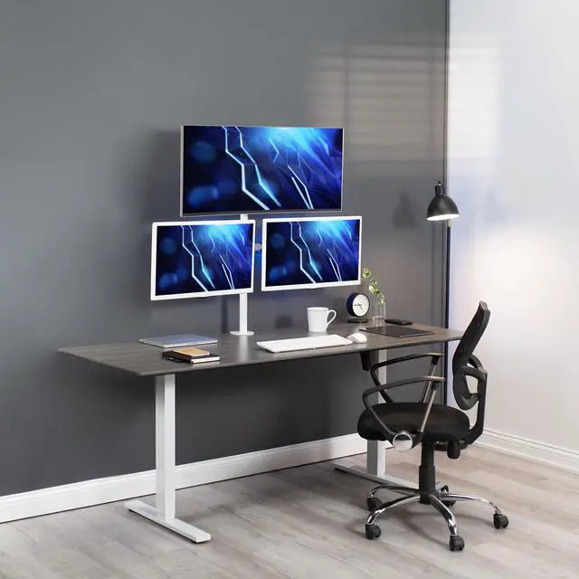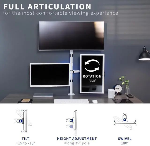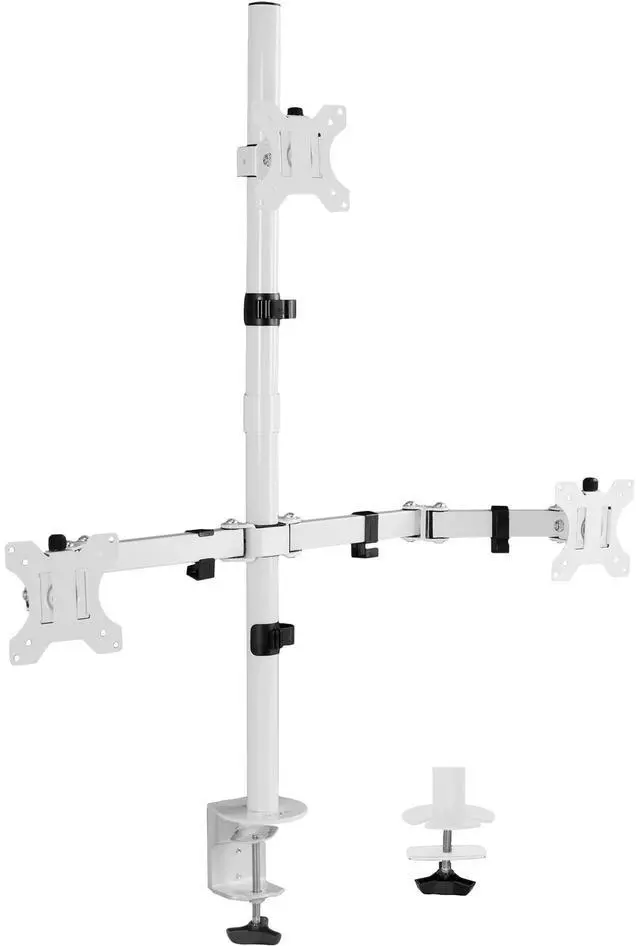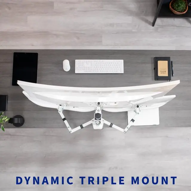 Enhance your screen display with the White Triple Monitor Desk Mount (STAND-V003TW) from VIVO! The triple monitor experience is great for the office multitasker or home gamer. Elevate your screens to a more comfortable and ergonomic viewing position while saving valuable desk space. With this stand's long monitor arms and fluid articulation, finding the optimal angle for each display is easy. High-grade steel and aluminum along with a heavy-duty C-clamp or optional grommet ensure your monitors will be kept secure. Mounting brackets are VESA compatible and support the majority of monitors on the market.