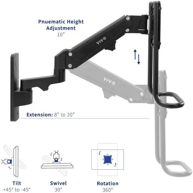 Protect your equipment and enjoy comfortable viewing angles with the Dual Monitor Wall Mount (MOUNT-G200B2) from VIVO! Thanks to the ergonomic design of this mount, you can reduce the strain on your neck, back, and eyes during your favorite sports game or work presentation. Getting your screen mounted to the wall clears up valuable space and protects your equipment from accidental damage. The dual bracket arm holds two monitors up to 27 and can be left off to convert this product to a single mount, supporting one ultrawide screen up to 49. Experience ergonomic viewing with multiple points of adjustment, powerful pneumatic lift, and fluid screen articulation. All hardware and instructions are provided to get your new mount installed in no time!