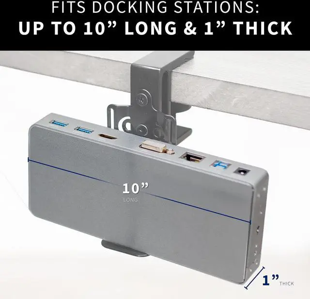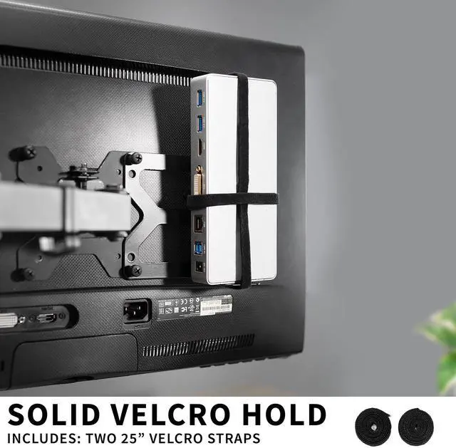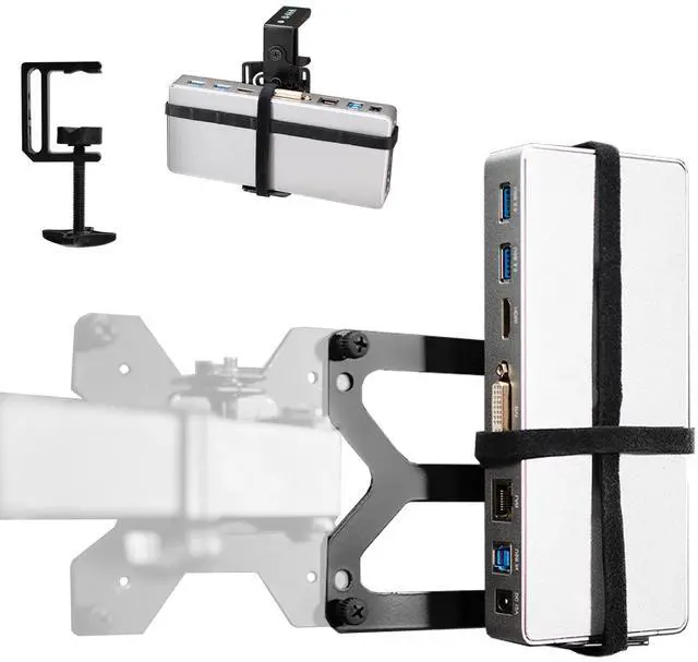 Reduce visual clutter at your workstation with the Universal Docking Station Mount (MOUNT-DS01) from VIVO! Conveniently getting your docking station off of the table surface and secured to your desk or monitor VESA pattern, this versatile holder gives you options. Velcro straps fit a variety of docking station brands on the market, and the universal clamp design features 3 mounting orientations for additional flexibility. This sturdy bracket also gives you installation options whether you want your docking station secured to the back of your VESA-compatible monitor screen, mounted under your desk, clamped to the table surface, and more!