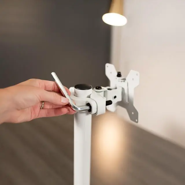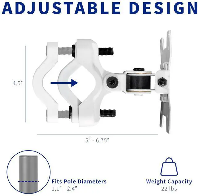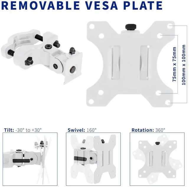 Mounting your Monitor or TV screen just got easier with White Universal Pole Mount Bracket (MOUNT-POLE01W) from VIVO! Whether you want to update your current monitor stands VESA compatibility or add mounting capability to an existing pole, this sturdy bracket has you covered. It holds one 13" to 30" screen weighing up to 22 lbs with VESA 75x75mm and 100x100mm mounting hole patterns. Fitting pole diameters from 1.1" to 2.4", this durable bracket gives you placement options for the ideal screen location. And thats not all! Once your screen is mounted, the bracket is adjustable with -30° to +30° tilt, 160° swivel, and 360° rotation for comfortable viewing angles that relieve tension on the neck, back, and shoulders. We provide all the necessary hardware for assembly, and a removable VESA plate makes mounting and unmounting your screen a fast and easy process.