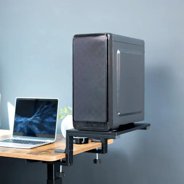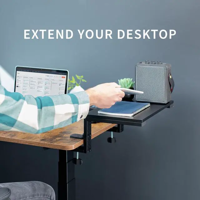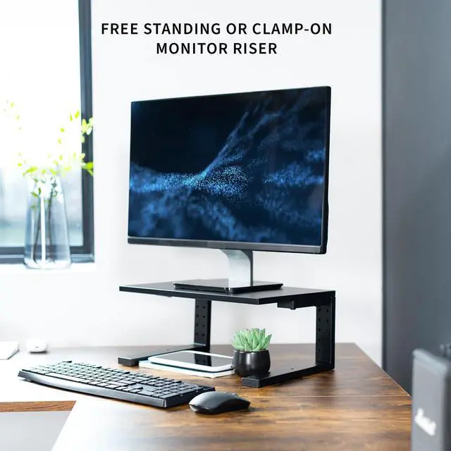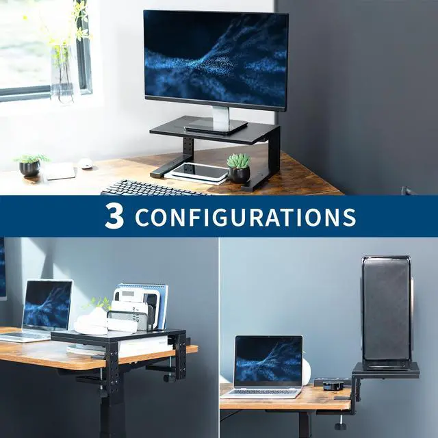 Create a desk extension platform for your Xbox or other gaming devices with the Black 15 Versatile Desktop Shelf Riser (DESK-SHELF15B) from VIVO! With a freestanding height of 6.5 and a 15 x 9.8 tray holding up to 44 lbs, you can enjoy more desk space for increased organization. This versatile product features 3 assembly options, allowing the shelf to extend your desktop for gaming and storage purposes, hang over your desk as a clamp-on laptop/monitor riser, or transform into a freestanding raised platform for flexible placement. Its time to give your monitors a boost, showcase desk items, or tidy up your workspace with added storage.