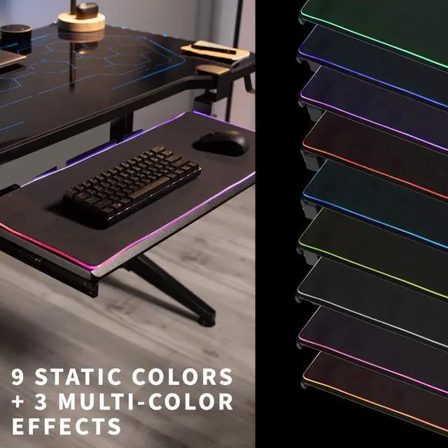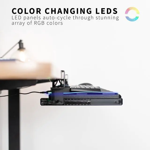 Win back valuable desk space and add RGB flare to your setup with the Black Clamp-on Keyboard Tray with RGB Pad (MOUNT-KB05P) from VIVO! Vibrant LED lights line the sides of the mouse pad with 9 powerful RGB colors and customized display settings. Featuring USB connectivity, easily power your LED tray through your laptop, PC, or A/C wall unit (not provided). This stylish LED keyboard tray features smooth gliding tracks for easy movement and solid C-clamps with anti-skid padding for damage-free installation. The under-desk tray placement creates an ergonomic setup that decreases fatigue and muscle strain on the neck, back, and shoulders. All hardware is provided for easy installation, so you can get your new tray mounted and enjoy comfortable typing angles in no time!
