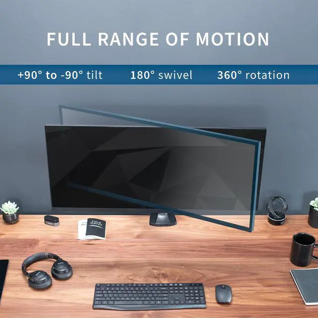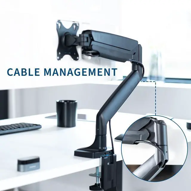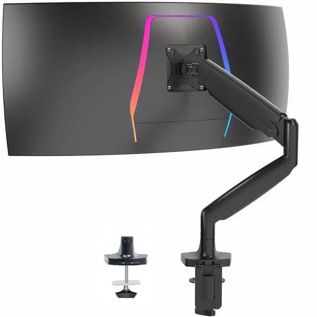 Reclaim your desk space and enjoy comfortable viewing angles with the Pneumatic Arm Single Ultrawide Monitor Desk Mount (STAND-V101Q) from VIVO! Supporting screens up to 40, you can elevate your ultra wide monitor to an ergonomic height and adjust the viewing angle with just the touch of a hand. Featuring high-quality aluminum construction, flexible joints, smooth height adjustment, a sturdy desk clamp and grommet mount, integrated cable management, and more, this ultra-wide mount is ready to transform your workspace. All hardware and instructions are provided for easy assembly, so you can get your stand installed to your desk and monitor mounted in no time!