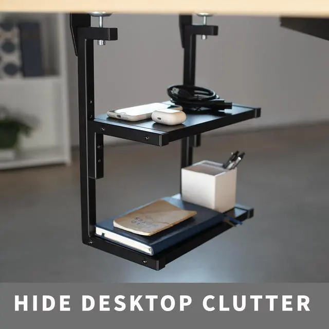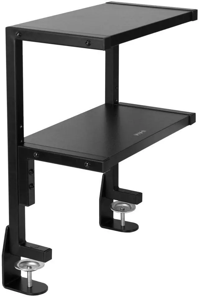 Add additional storage to your workstation with the Above/Below Clamp-on 13 Dual Shelf (STAND-SHELF2C) from VIVO! Featuring 12.6 x 7.1 shelves, this clamp-on dual platform reduces desktop clutter with space for gaming accessories, office supplies, hard drives, decor, notebooks, and more. The shelving unit stands 15.4 tall, holding up to 11 lbs between the 2 shelves. Reversible clamp design allows the rack to be mounted above or below the table top for a customized setup. The secure C-clamps anchor to the desktop, providing a solid surface that raises and lowers with your desk with little shake or movement.