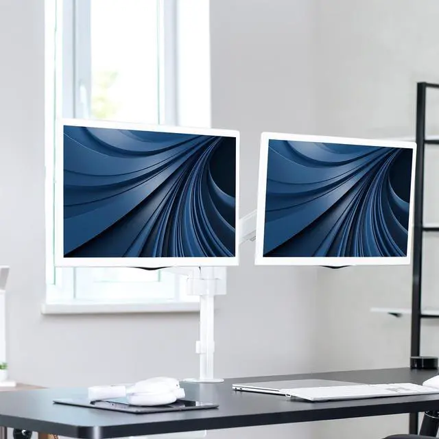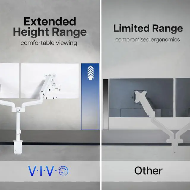 Increase efficiency and optimize viewing angles with the White Dual Monitor Mount (STAND-V002KW) from VIVO! Win back valuable desk space by elevating your monitors to an ideal viewing height with this high-grade steel stand built for scratch resistance and security. Designed with user-geared features such as arm articulation, pneumatic spring height adjustment, a sturdy C-clamp, integrated cable management, and more, this mount is customizable to your particular office needs. The versatility of screen placement allows ergonomic viewing that aids in decreased fatigue and muscle strain on the neck, back, and shoulders. The classy appearance adds a modern look to any office while providing ample support for two monitors. All hardware is provided for easy assembly, so you can get your stand mounted in no time!