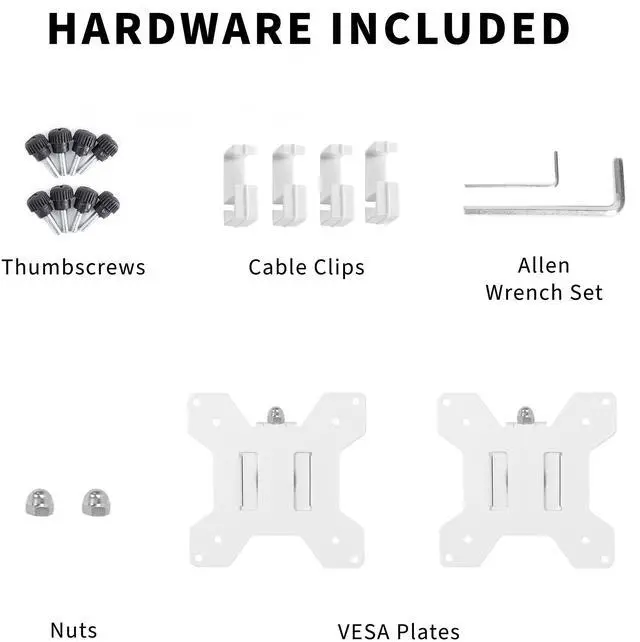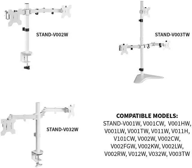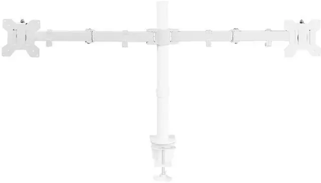 Save desk space and increase productivity by turning your current stand into a dual monitor setup with double monitor arm (PT-SD-AM02AW) from VIVO! Made to support 13" to 27" screens, this solid steel item is designed for sturdiness, scratch resistance, and durability with a sleek white color that blends into any environment. If you currently have a monitor stand and would like to add an adjustable arm designed for two monitor screens, this is the product for you! Featuring full articulation of +80 degrees to -90 degrees tilt, 180 degrees swivel, and 360 degrees rotation for comfortable viewing angles, cable management clips to keep cords organized, and two VESA brackets containing 75x75mm and 100x100mm mounting holes, this arm is ready to enhance your work experience!