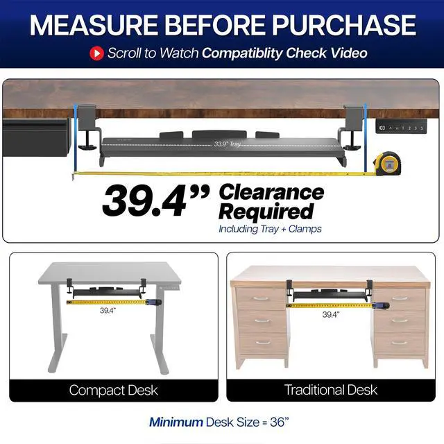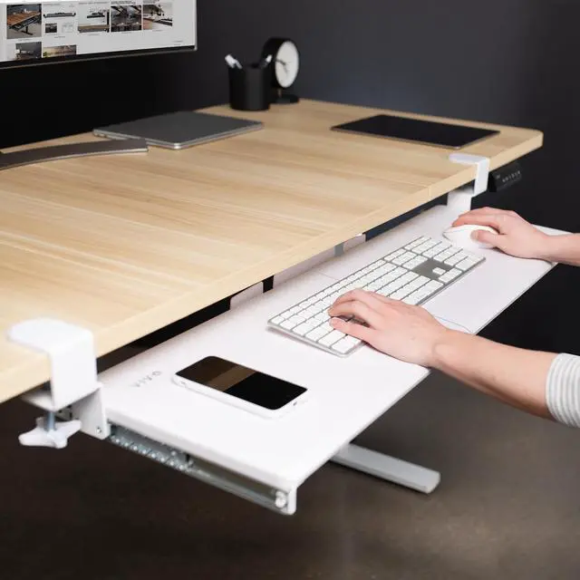 Enjoy the benefits of ergonomic typing angles and a work area thats spacious and extra sturdy with the White Clamp-on Extra Long Keyboard Tray (MOUNT-KB15EW) from VIVO! Win back valuable desk space by adding a lower-tier surface for the keyboard, mouse, and other small items. Featuring smooth gliding motion for easy placement, sturdy C-clamps for convenient mounting, and anti-skid padding for scratch resistance, this mount was built to perform! Under-desk tray placement creates an ergonomic setup that decreases fatigue and muscle strain on the neck, back, and shoulders. The sleek appearance adds a modern look to any office while providing ample support for your keyboard and accessories. All hardware is provided for easy installation, so you can get your tray mounted and organized in no time!