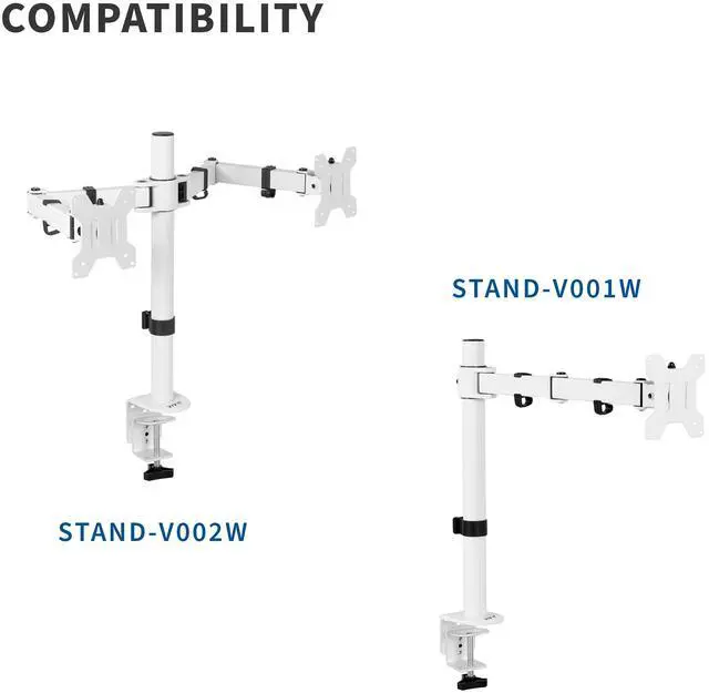Save desk space and make your workstation more ergonomic by using this fully adjustable monitor arm (PT-SD-AM01AW) from VIVO! Made of solid steel, this item is designed for sturdiness, scratch resistance, and durability with a clean white color that blends into any environment. If you currently have a monitor stand and would like to turn it into a single monitor stand with an adjustable arm, this is the product for you! Featuring full articulation of -15° to +15° tilt, 360° swivel, and 360° rotation for comfortable viewing angles, cable management clips to keep cords organized, and a VESA bracket containing 75x75mm and 100x100mm mounting holes, this arm is ready to enhance your work experience! Please see the list of compatible VIVO stand models below.