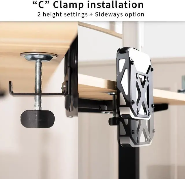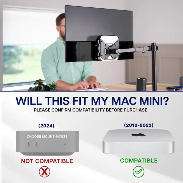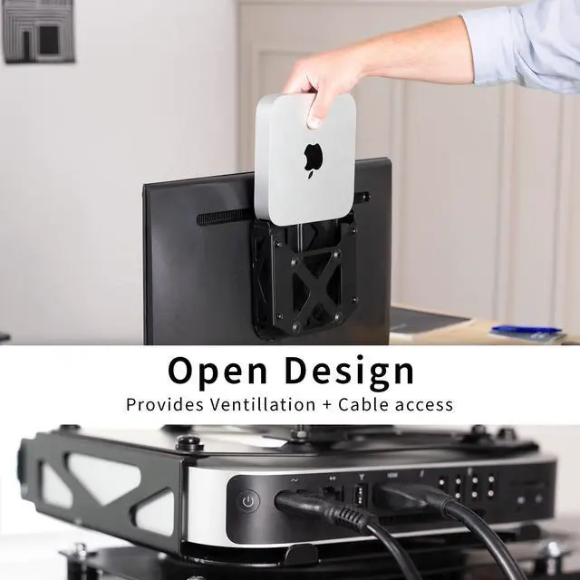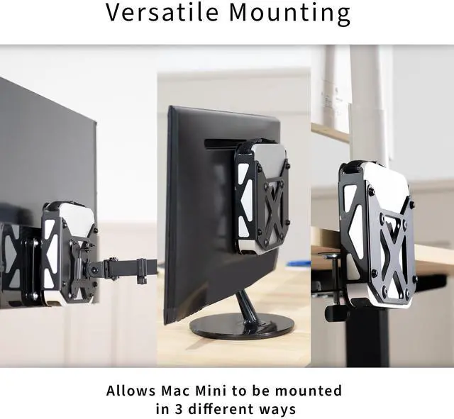 Securely mount and conceal your Mac Mini with the VESA Mount Designed for the Mac Mini (MOUNT-MINI1) from VIVO! Made for mid-2010 to 2023, this VESA-compatible mount makes mounting and protecting your mini PC a breeze. The open, ventilated frame increases airflow to your PC and helps prevent overheating. Setup options include mounting between a monitor and VESA arm, installing to the back of your monitor with an OEM stand, or clamping to your desktop to help declutter your workstation. All placement options provide easy access to your Mac in a safe, out-of-the-way location. All hardware and instructions are provided for installation, so you can create your preferred layout in no time!