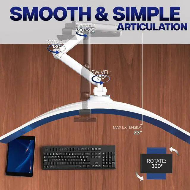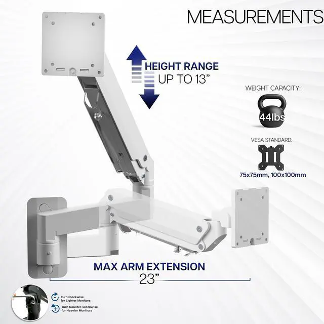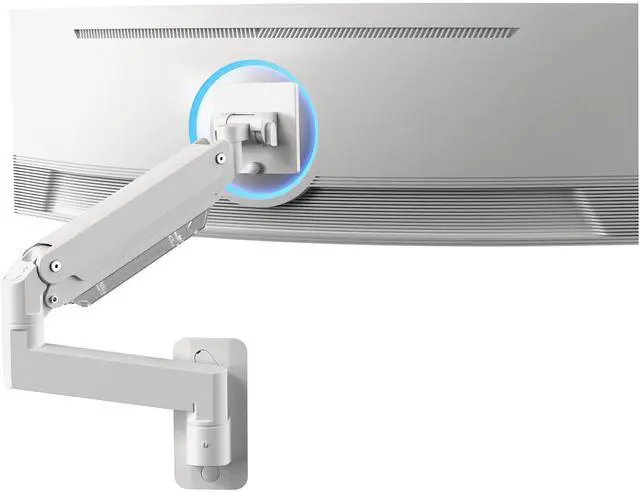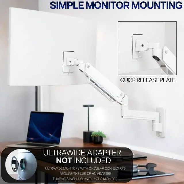 Win back valuable desk space with the White Pneumatic Arm Single Ultrawide Monitor Wall Mount (MOUNT-V101G1W) from VIVO! Elevate your ultra wide screen to an ergonomic height and adjust the viewing angle with just the touch of a hand. Easily create a floating setup with this heavy duty wall-mounted arm. Featuring high quality aluminum construction, flexible joints, smooth pneumatic height adjustment, integrated cable management, and more, this mount is ready to transform your workspace. The versatility of screen placement encourages comfortable viewing that aids in decreased muscle strain on the neck, back, and shoulders. All hardware and instructions are provided for easy assembly, so you can get your large monitor mounted in no time!