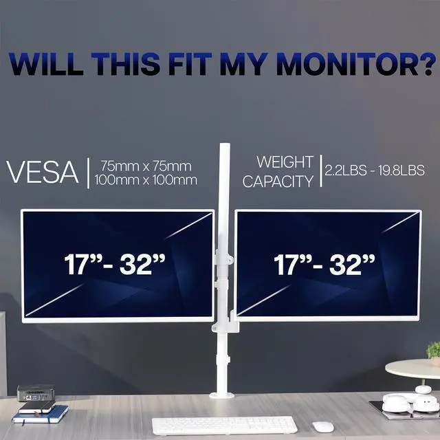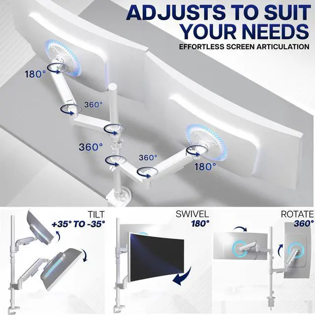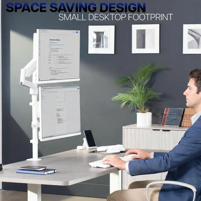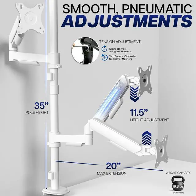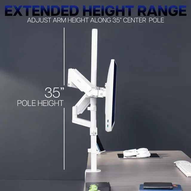 Increase efficiency and optimize viewing angles with the White Pneumatic Arm Dual Monitor Extra Tall Desk Mount (STAND-V012KW) from VIVO! Win back valuable desk space by elevating your monitors to an ideal viewing height with this high-grade steel stand built for scratch resistance and security. Featuring arm articulation, pneumatic spring height adjustment, a sturdy C-clamp, integrated cable management, and more, this mount is built to perform! The versatility of screen placement allows ergonomic viewing that aids in decreased fatigue and muscle strain on the neck, back, and shoulders. The modern appearance complements any office setting while you enjoy double-screen viewing. All hardware is provided for easy assembly, so you can get your stand mounted in no time!