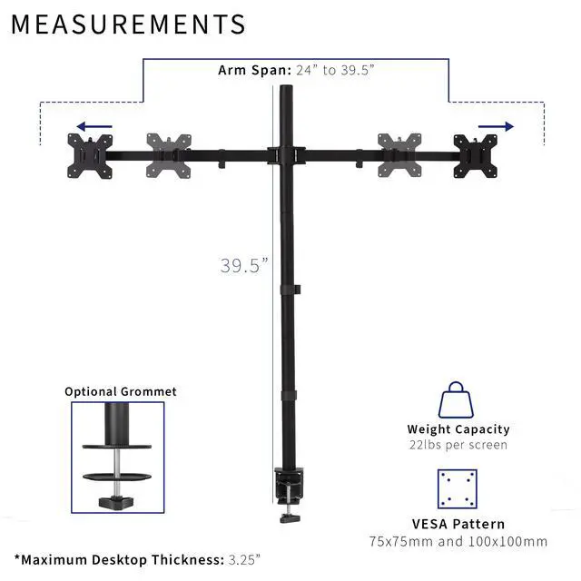Enjoy a truly flush desk setup with the Telescoping Extra Tall Dual Monitor Desk Mount (STAND-TS38C-T) from VIVO! Premium telescoping arms adjust in length to fit your monitors, accommodating 27 to 38 screens with ease. The adaptable nature allows for a snug side-by-side monitor positioning without fear of arms extending beyond the bounds of your desk, creating a setup thats flush with the wall. The heavy-duty arms overlap and feature fewer joints than typical mounts which creates a stronger, more durable hold for ultrawide monitors. Additional features include an extra tall pole for an elevated screen display, sleek cable management for an organized appearance, screen articulation for ergonomic viewing angles, and height adjustment for customized placement. All hardware and instructions are provided so you can get your new stand assembled in no time!