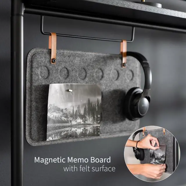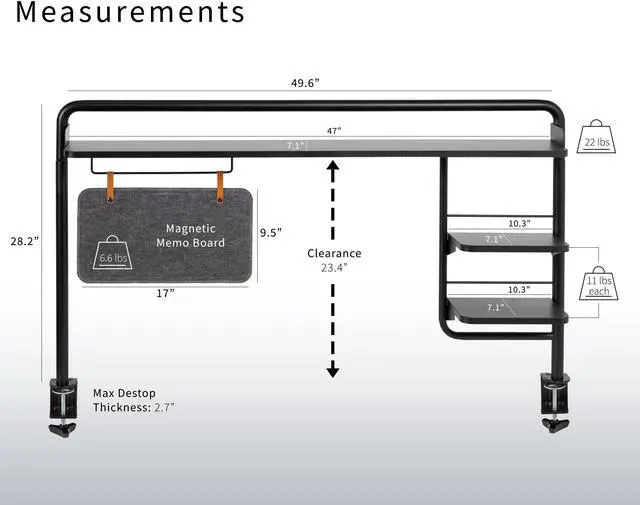 Modernize your workstation and add multi-level storage space with the Black Clamp-on Desktop Shelving System (DESK-SHELF55A) from VIVO! With a full-length top shelf, two small accessory shelves, and a magnetic memo board, this shelving display has all your storage needs covered. Win back much-needed desk space as you place frequently used accessories or decor on sturdy shelves, giving your desk a multi-dimensional appearance. The entire shelving unit secures to your desk with heavy-duty C-clamps that hold everything tightly in place without damaging your desk surface. Keep your notes at eye-level with the magnetic memo board, and adjust the height of the smaller shelves along the side railing system.