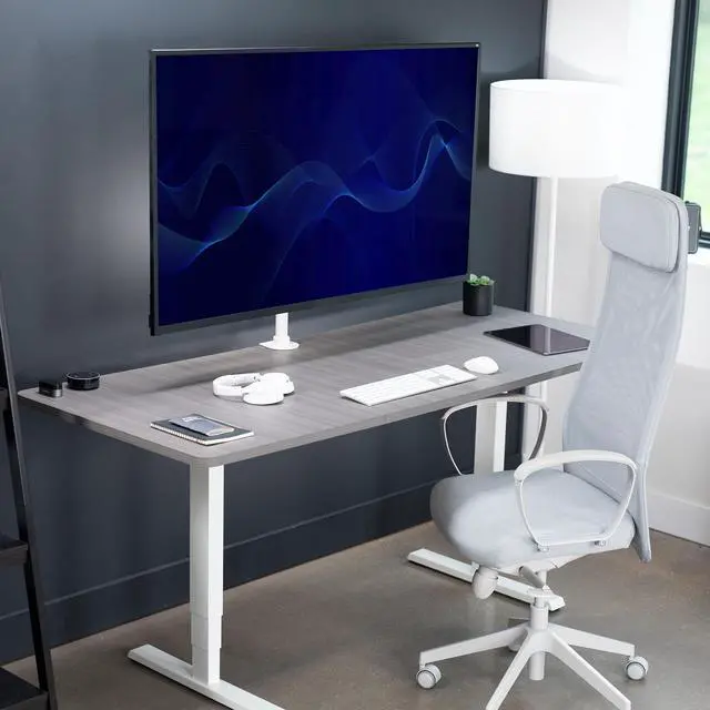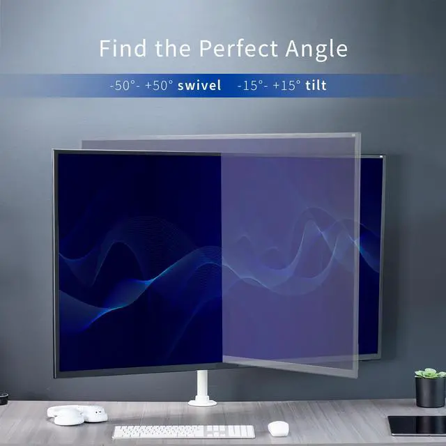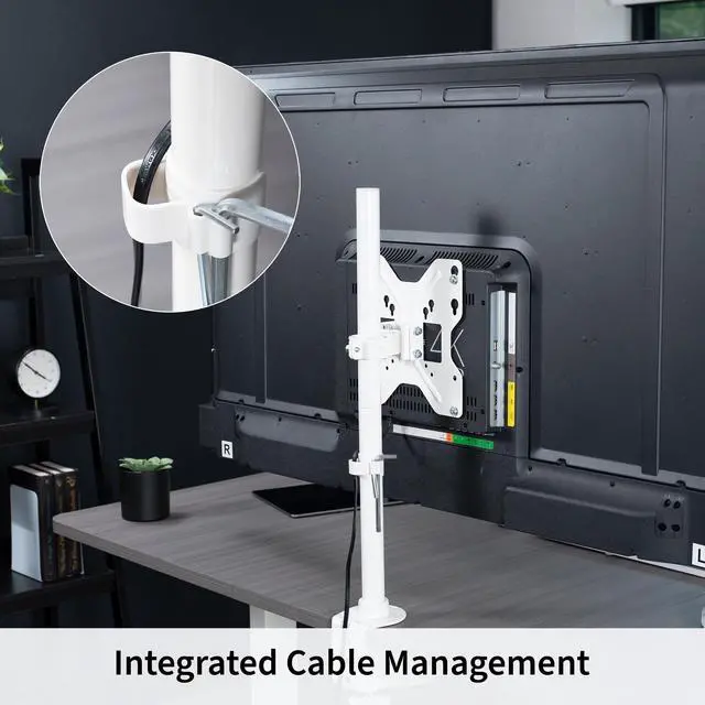 Improve productivity and create comfortable viewing angles with White Single Wide Screen TV Desk Mount (STAND-V155CW) from VIVO! Win back valuable workspace by using this heavy-duty TV mount to elevate the screen off of your desk. Constructed of high-grade steel, this stand has been 3 times strength tested to support a 23" to 55" screen weighing up to 66 pounds. The modern, white appearance blends well with virtually any environment. Offering a variety of features including simple height adjustment for comfortable viewing angles, a sturdy desk clamp for excellent support, and integrated cable management to keep cords clean and organized, this stand was designed to perform!