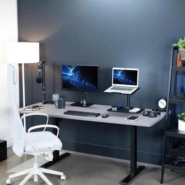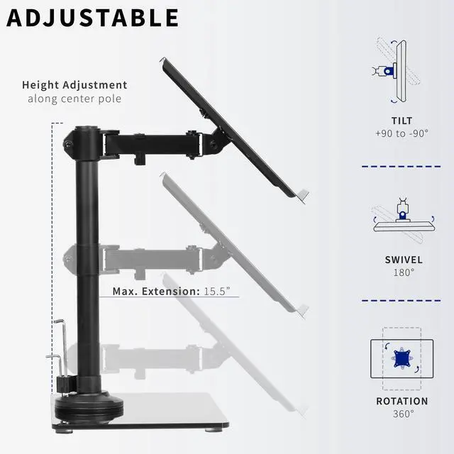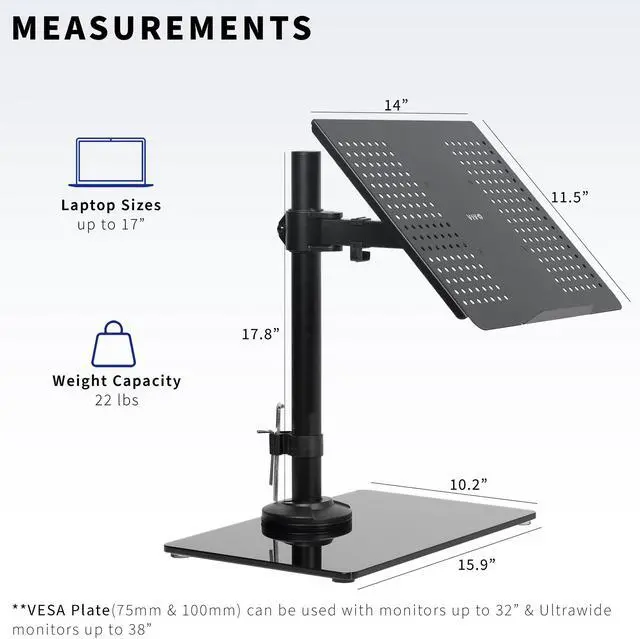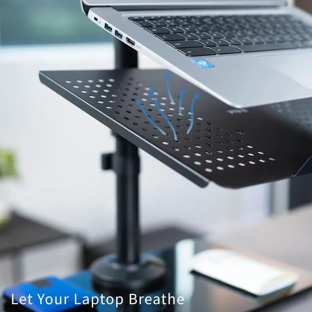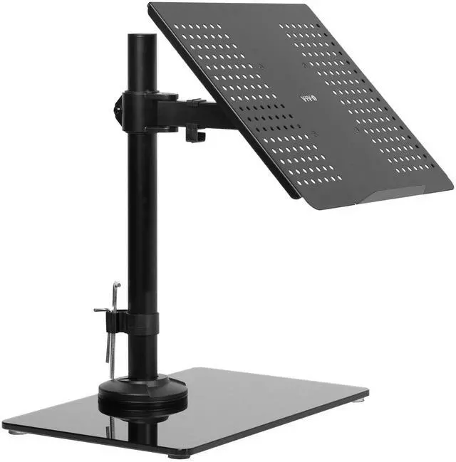 Elevate your work to a more ergonomic position and save valuable desk space with the Laptop Desk Stand (STAND-V001FGL) from VIVO! No need to install anything to your table with this sturdy mount. The sleek, glass base and high-grade steel design hold your laptop safe and secure without the need for drilling or clamping. Featuring tilt, swivel, rotation, and height adjustment along the center pole, you can find optimal viewing angles that increase work comfort. The ventilated tray holds laptops up to 17 to accommodate most brands on the market.