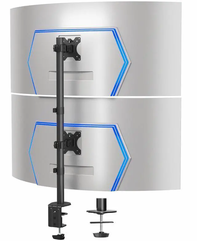 Clear up desk space by consolidating 2 ultrawide monitors on a single stand in a vertically stacked array with the Dual Ultrawide Vertical Monitor Desk Mount (STAND-V200R) from VIVO! Features include smooth articulation for comfortable viewing angles, integrated cable management for neatly routed cords, and height adjustment along the center pole for customized screen placement. Made of high-grade steel and aluminum, this stand fits ultrawide monitors up to 45 in size and 25 lbs in weight. Every joint is able to be tightened, so you can make your screen setup as fluid or stationary as desired.