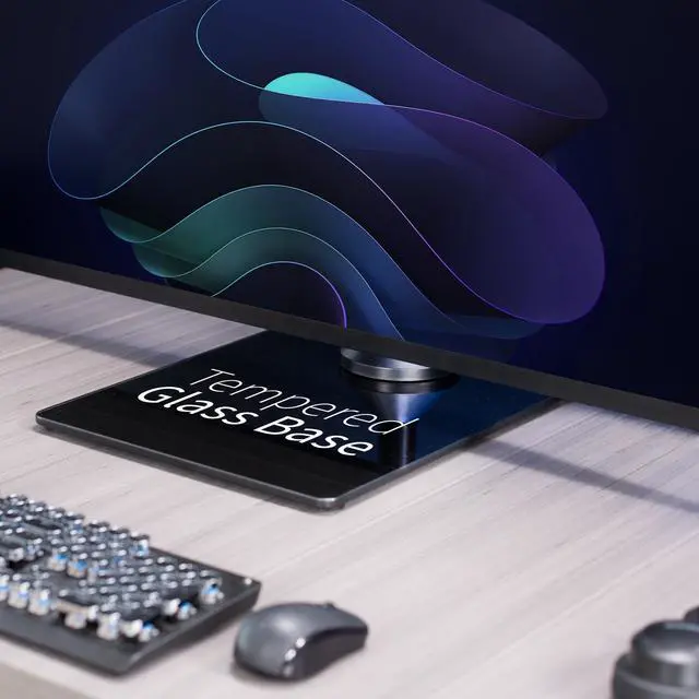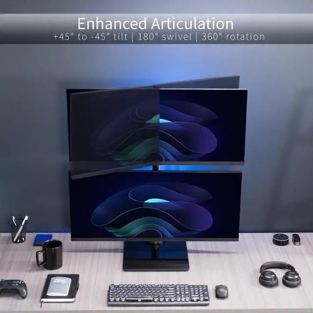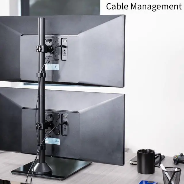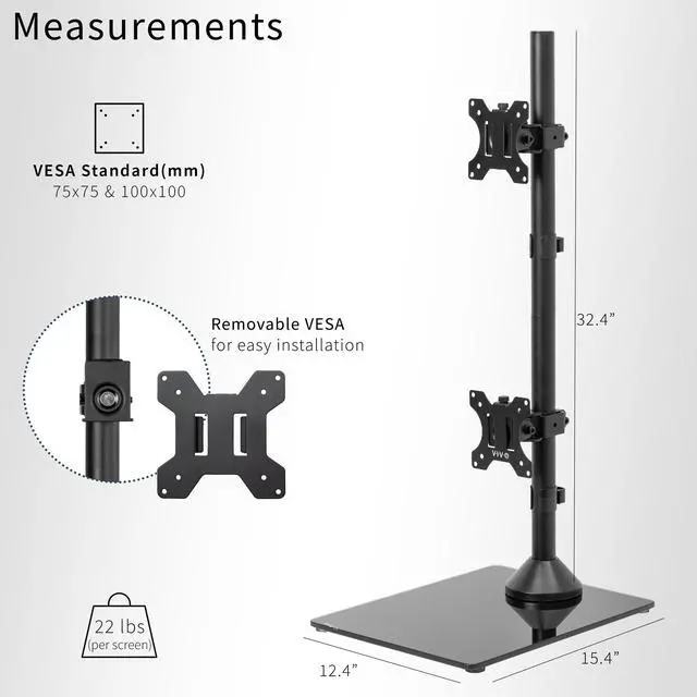 Clear up desk space by consolidating 2 monitors on a single stand in a vertically stacked array using Dual Vertical Monitor Desk Stand with Glass Base (STAND-V002LG) from VIVO! Features include smooth articulation for comfortable viewing angles, integrated cable management for neatly routed cords, an elegant tempered glass base for stability, and height adjustment along the center pole for customized screen placement. Made of high-grade steel and aluminum, this stand fits regular and ultrawide monitors up to 34 in size and 22 lbs in weight each. Each joint is able to be tightened, so you can make your screen setup as fluid or stationary as desired.