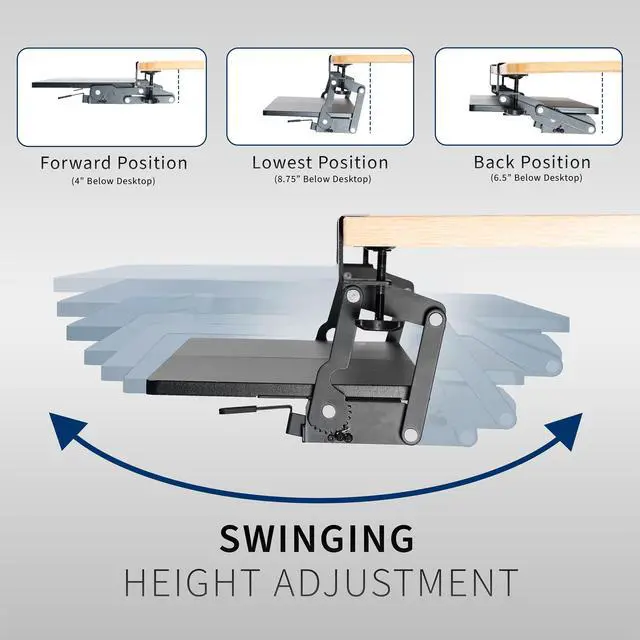 Save desk space and enjoy comfortable typing angles with the Black Clamp-on Keyboard Tray with Swinging Height Adjustment (MOUNT-KB08V) from VIVO! Enhance your typing posture by placing your keyboard tray below the desk surface, and enjoy swinging forward and backward motion as well as 12-step locking height adjustment. When not in use, simply swing the tray under the desk and out of the way. This product comes in a modern black color to complement a variety of work and home environments. Getting your keyboard tray assembled is a breeze, and heavy-duty C-clamps secure to your desktop for damage-free installation.