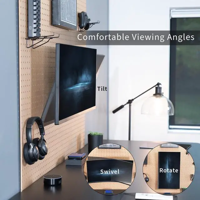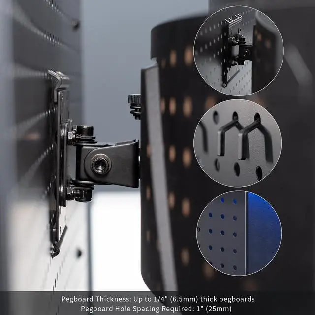 Expand your screen mounting capability with the Single Monitor Pegboard Panel Mount (MOUNT-PB1) from VIVO! Whether you have a clamp-on desk pegboard divider or a freestanding pegboard panel, if it doesnt exceed 0.25 in thickness and has 1 hole spacing, you can install this monitor mount anywhere on the pegboard! The solid steel bracket holds 1 screen up to 32 in size and 17.6 lbs in weight with VESA 75x75mm or 100x100mm hole patterns. Once your screen is secured in place, the mount also features tilt and swivel capability for comfortable viewing angles. We provide all the hardware and simple 4-step instructions for assembly, and a removable VESA plate makes mounting and unmounting your screen a fast and easy process.