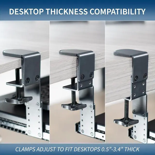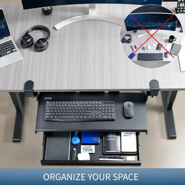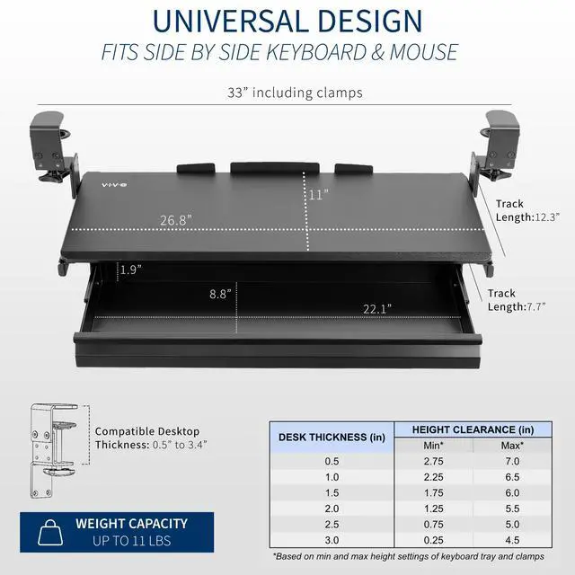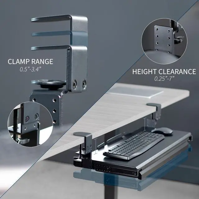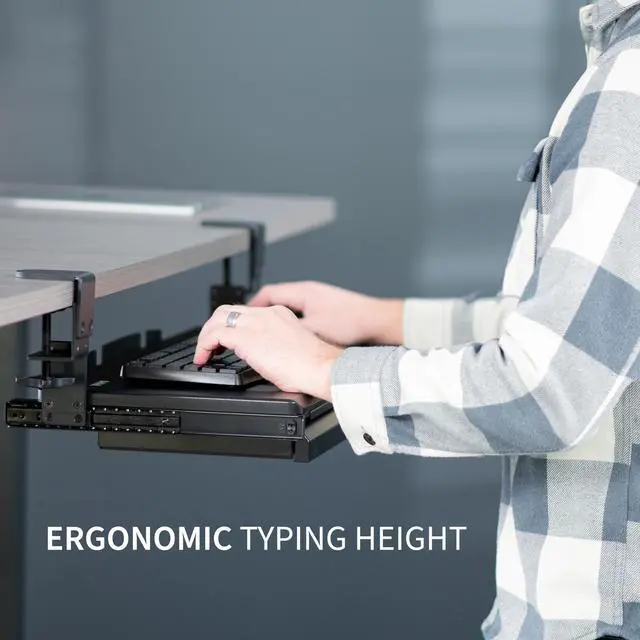Experience ergonomic typing angles with the Black Clamp-on Height Adjustable Keyboard Tray with Drawer (MOUNT-KB05HB-DR) from VIVO! Win back valuable desk space by adding a lower-tier surface for your keyboard, mouse, and other small items. Designed with smooth gliding motion for easy placement, sturdy C-clamps for convenient mounting, and anti-skid padding for scratch resistance, this mount was built to perform! Height adjustable clamps and side brackets allow customized tray placement for comfortable typing angles and desired clearance under the desk surface. The low profile storage drawer holds small accessories conveniently out of sight for an organized workstation. All hardware is provided for easy installation to get your tray mounted and organized in no time!