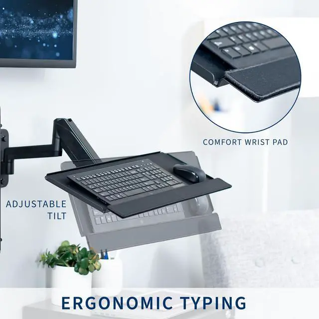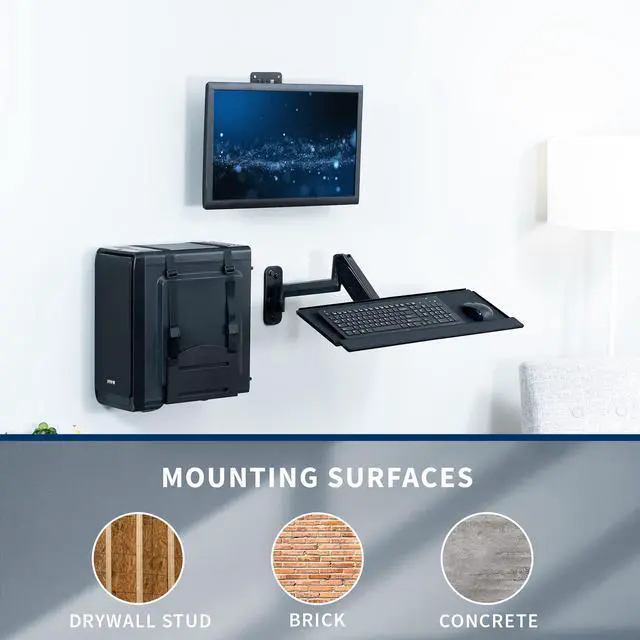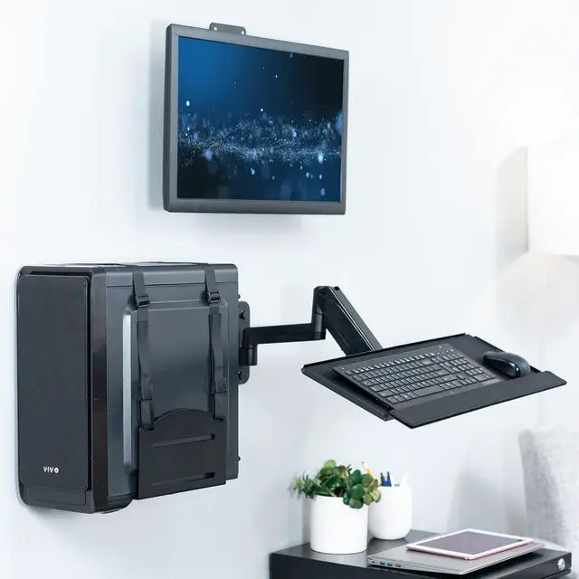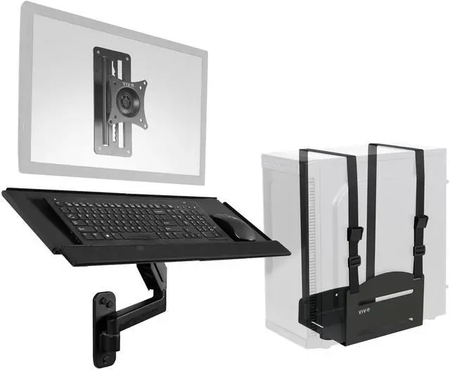 Experience a complete wall-mounted sit-stand workstation with the Single Monitor Wall Mount + Keyboard Tray Wall Mount + PC Wall Mount (MOUNT-VWKB1P) from VIVO! Designed to make your work experience more convenient and ergonomic, this kit allows comfortable viewing and typing angles throughout the day. Our wall-mounted station allows you to switch to any position easily with its monitor sliding mechanism, screen articulation, and counterbalance tray adjustability. The sturdy PC holder can be installed in an easy-to-reach location close to your screen and keyboard. Compatible with most 17" to 32" monitors with standard VESA 75x75mm or 100x100mm hole patterns, this power kit is easy to install with all instructions and hardware provided.