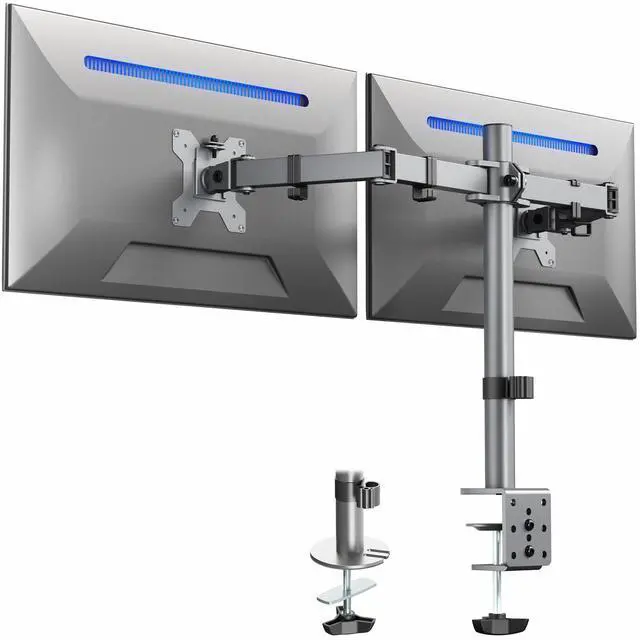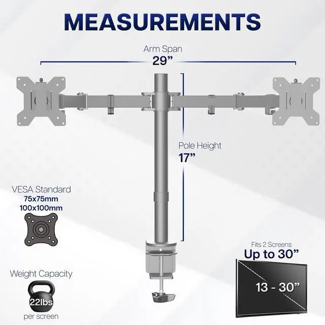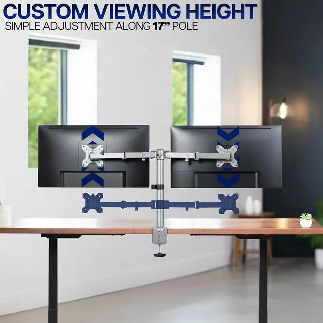 Enjoy double the viewing with the Gray Dual Monitor Desk Mount (STAND-V002-GY) from VIVO! Made of high-grade steel and aluminum, this stand fits most LCD monitors 13 to 30 in size and supports up to 22 lbs per monitor. Every joint is able to be tightened, so you can adjust exactly how fluid/stationary you want everything to be. Special features include the ability for each individual VESA plate to be adjusted up and down by 0.5 so your monitors will be perfectly aligned. We also make mounting your screens easy with detachable VESA plates that screw into your monitors and then slide back onto the frame of the stand. Heavy duty C-clamp and grommet mounting options are included. All hardware and instructions are provided so you can get your new stand assembled and providing comfortable viewing angles in no time!