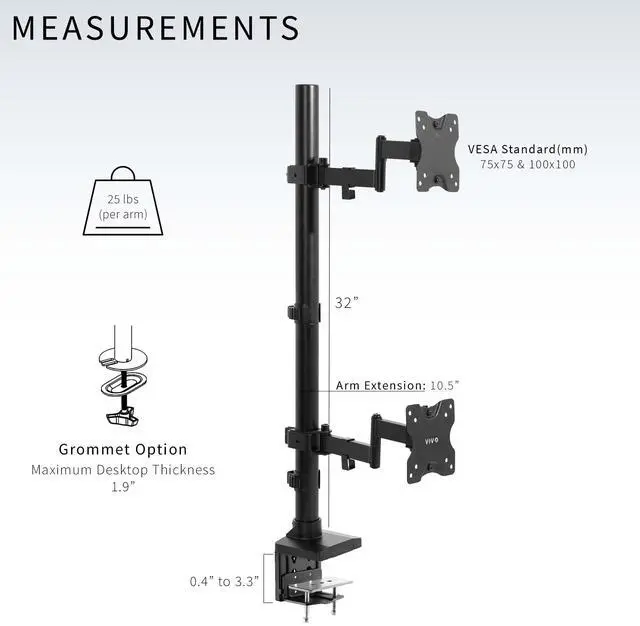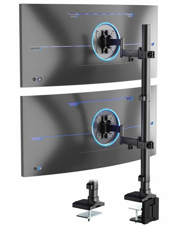 Get the most out of your ultrawide setup with the Dual Ultrawide Vertical Monitor Desk Mount (STAND-V202T) from VIVO! The heavy duty C-clamp creates a solid mounting surface for ultrawide monitors up to 43, and the seamless dual stacked array clears up much needed desk space. Features include smooth articulation for comfortable viewing angles, integrated cable management for neatly routed cords, and height adjustment along the center pole for customized screen placement. Made of high-grade steel and aluminum, this stand holds up to 50 lbs in weight with ease. Every joint is able to be tightened, so you can make your screen setup as fluid or stationary as desired.