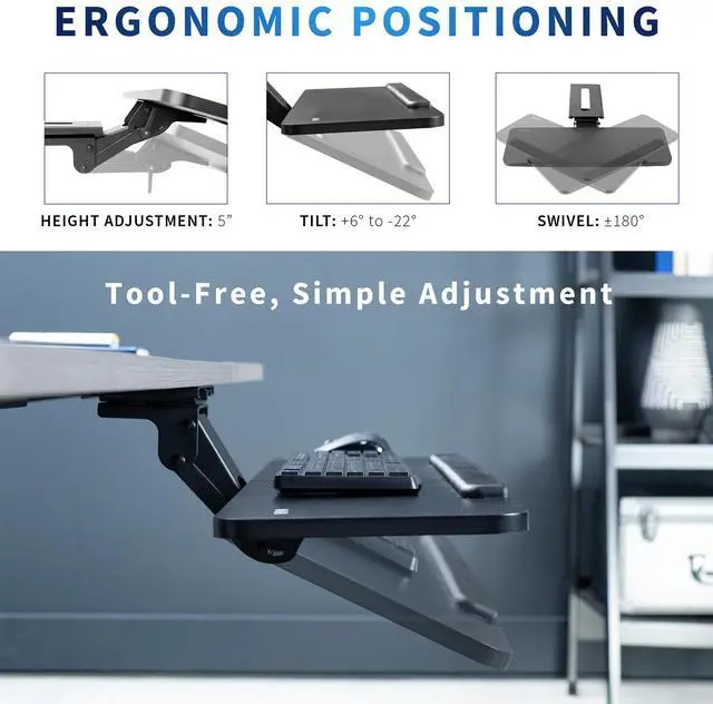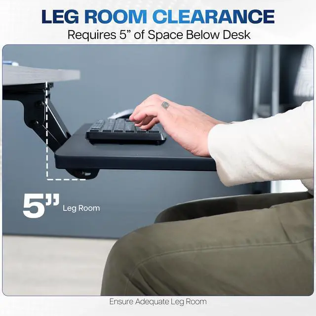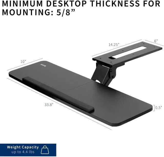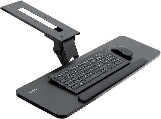 Enhance your typing posture with the Black 34" Under Desk Keyboard Tray (MOUNT-KB36B) from VIVO! An adjustable and convenient workflow is ideal and easy on the body as you type at a more ergonomic position. When not in use, simply slide the tray under the desk and out of the way. This sturdy product comes in a black matte finish to match a variety of desks on the market and provide a modern appearance. The sleek metal track is low profile and slides under the desk when not in use. Getting your keyboard tray set up is a breeze, and we provide all the hardware for under-desk mounting.