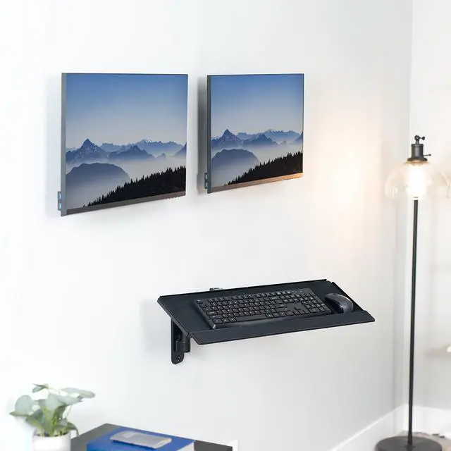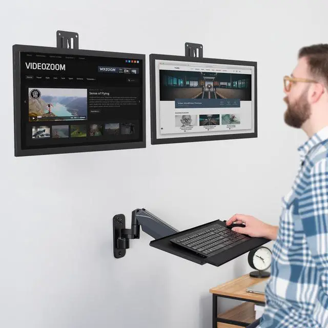 Experience your own wall-mounted sit-stand workstation with the Dual Monitor Wall Mounts + Keyboard Tray Wall Mount (MOUNT-VWKB2) from VIVO! Designed to make your work experience more convenient and ergonomic, this combo allows comfortable viewing and typing angles throughout the day. Our wall mounting station allows you to switch to any position easily with its monitor sliding mechanisms and counterbalance tray adjustability. Swivel, tilt, rotation, and height adjustment help you maintain comfort and variety in your posture. Compatible with most 17" to 32" monitors with standard VESA 75x75mm or 100x100mm hole patterns, this product combo is easy to install with all instructions and hardware provided.