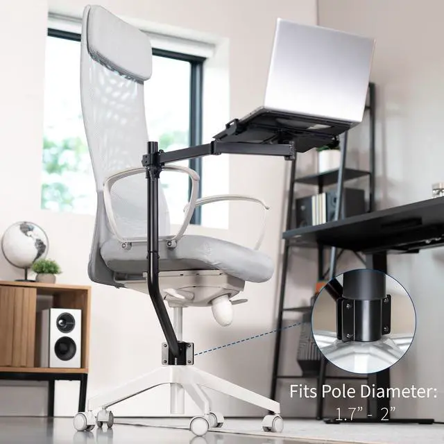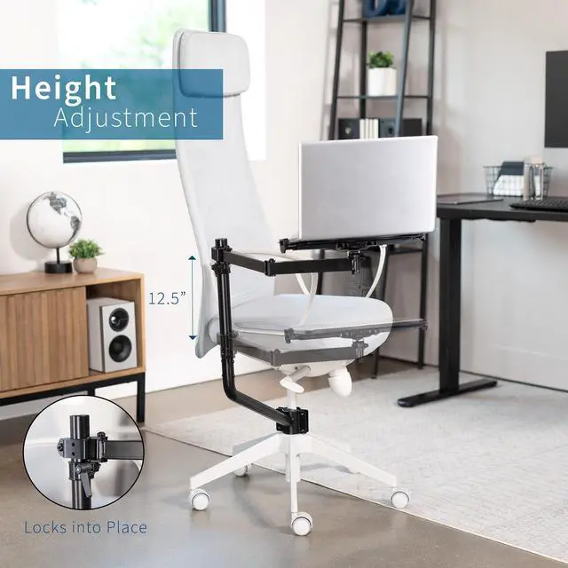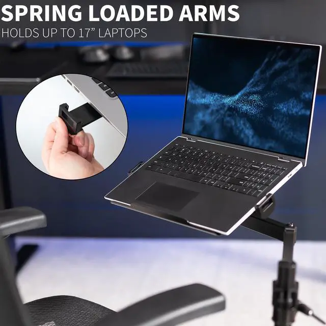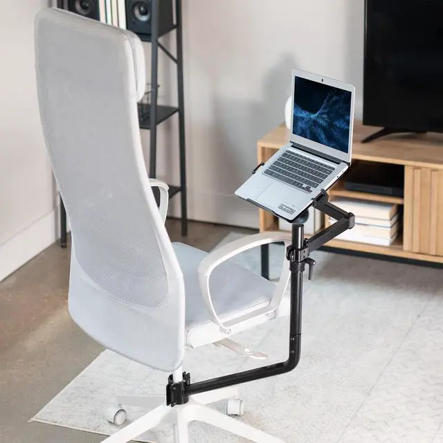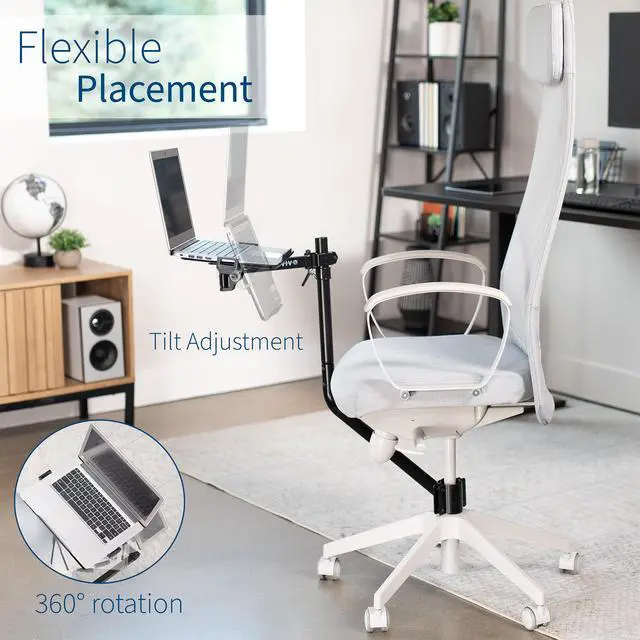 Attach a laptop tray directly to your office chair with the Black Office Chair Mounted Laptop Tray (MOUNT-KB08CL) from VIVO! This innovative mount positions your laptop in a comfortable location and saves valuable space on your desk. The tray features adjustable tilt and full rotation for convenient placement and comfortable typing angles, while the spring-loaded arms adjust to fit your compatible laptop and hold it securely in place. Upgrade your workstation today, and enjoy ergonomic typing and viewing angles personalized to your needs!