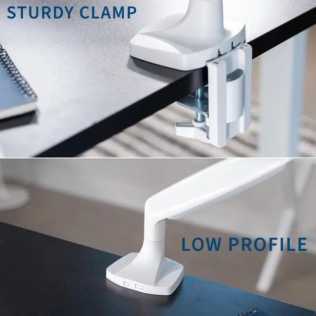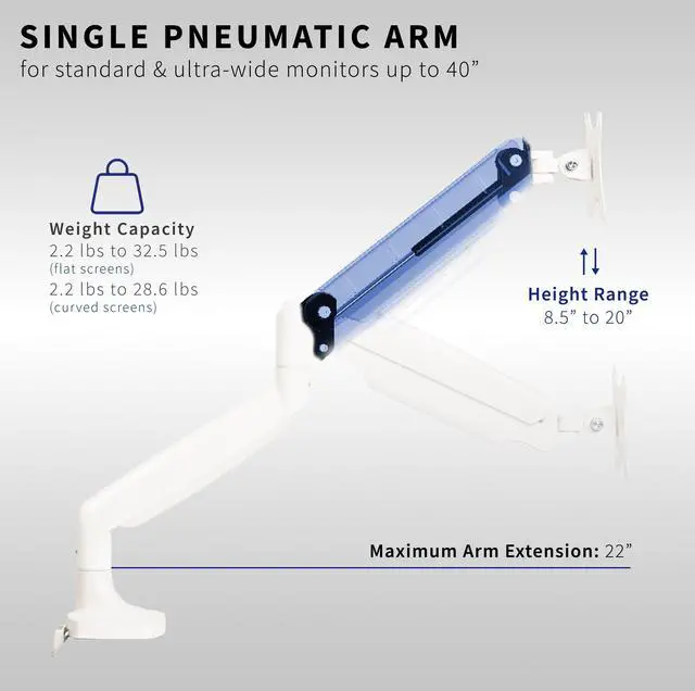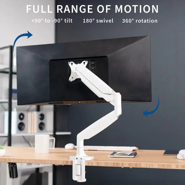 Reclaim your desk space and enjoy comfortable viewing angles with the White Pneumatic Arm Single Ultrawide Monitor Desk Mount (STAND-V101QW) from VIVO! Supporting screens up to 40, you can elevate your ultra wide monitor to an ergonomic height and adjust the viewing angle with just the touch of a hand. Featuring high-quality aluminum construction, flexible joints, smooth height adjustment, a sturdy desk clamp and grommet mount, integrated cable management, and more, this ultra-wide mount is ready to transform your workspace. All hardware and instructions are provided for easy assembly, so you can get your stand installed to your desk and monitor mounted in no time!