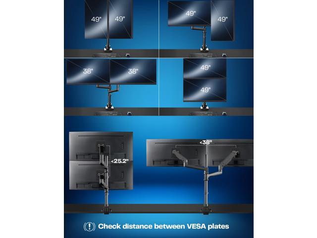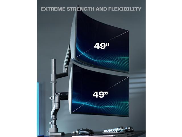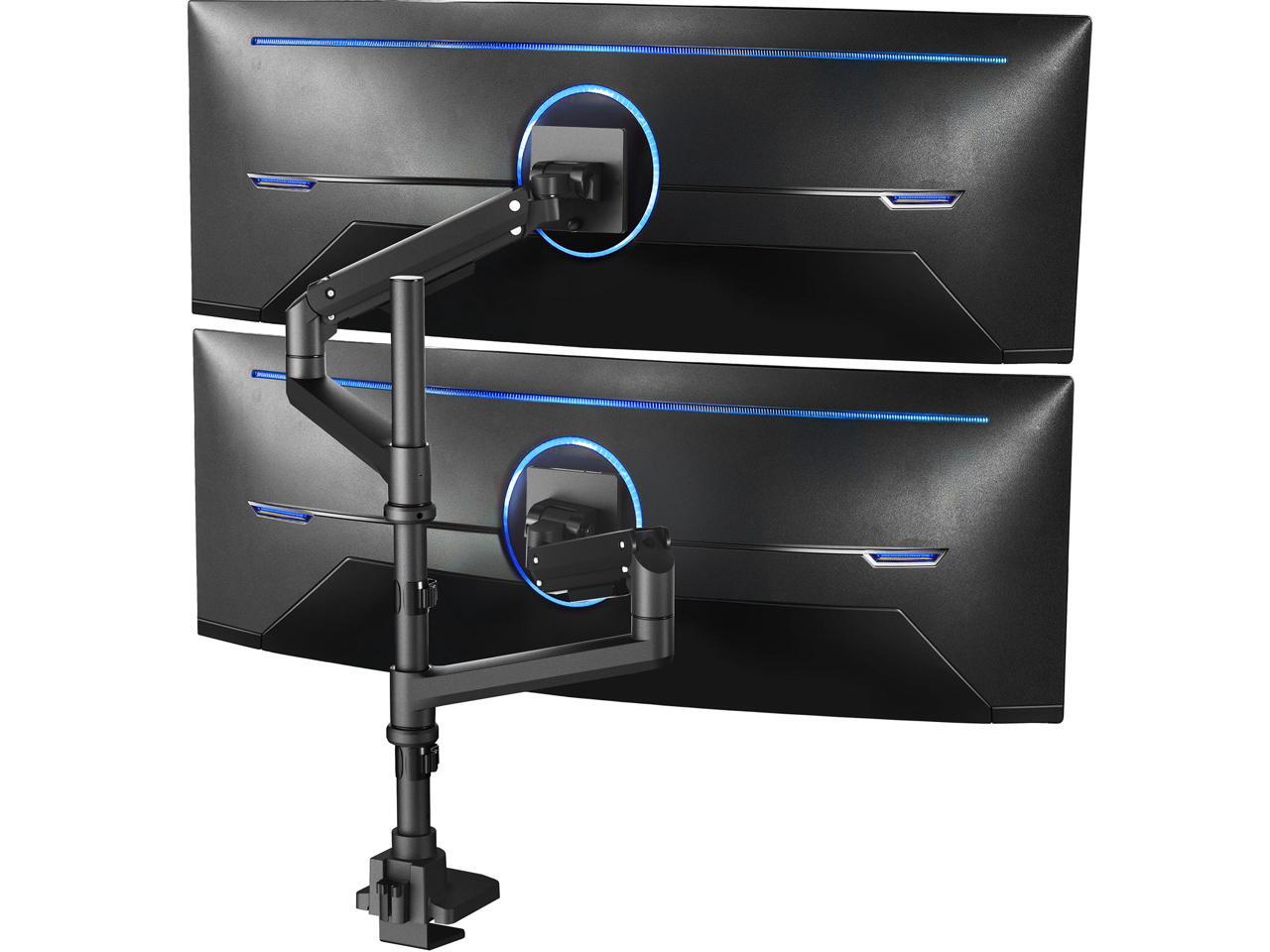 Dual Ultrawide Desk Mount: Fits 2 ultra-wide screens up to 49 (stacked) or 38 (side-by-side) with VESA 75x75mm or 100x100mm mounting holes. Holds 5.5 lbs to 44 lbs per arm