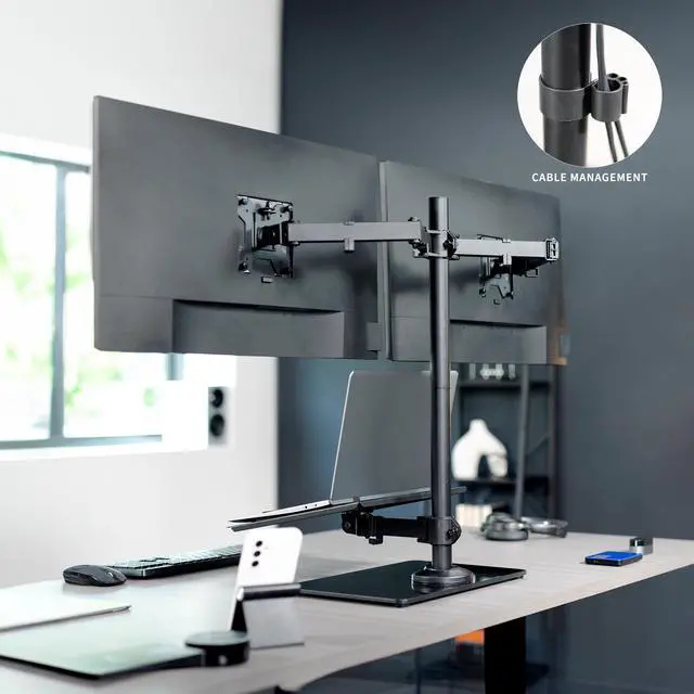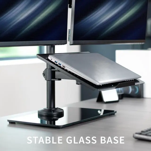 Elevate your work to a more ergonomic position and save valuable desk space with the Dual Monitor and Laptop Desk Stand (STAND-V003FGL) from VIVO! No need to install anything to your table with this sturdy mount. The sleek, glass base and high-grade steel design hold your monitors and laptop safe and secure without the need for drilling or clamping. Featuring tilt, swivel, rotation, and height adjustment along the center pole, you can find optimal viewing angles that increase work comfort. The mounting brackets support VESA 75x75mm and 100x100mm hole patterns, fitting the majority of monitors on the market. The ventilated tray holds laptops up to 17 to complete your triple-screen display.