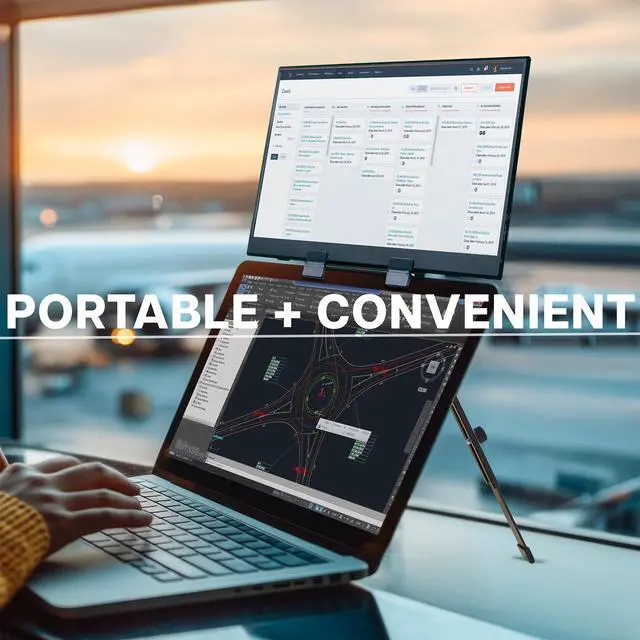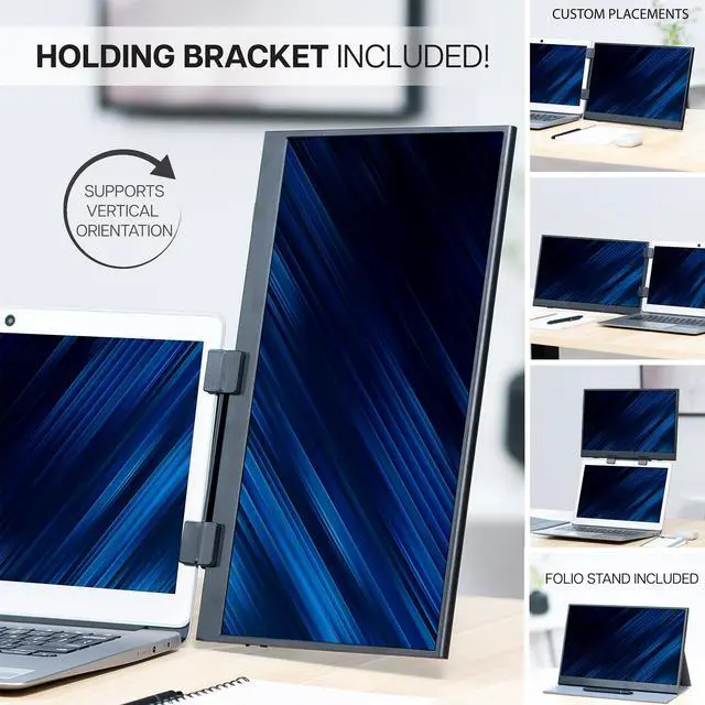 Its time to enhance your workflow with the 15.6 Portable Monitor with Laptop Extension Holder (STAND-PM01M) from VIVO! This innovative mount system secures directly to your laptop (up to 18.5) and holds the portable monitor above your screen, to the left of your screen, or to the right of your laptop for 3 configuration options! The folding, lightweight design is perfect for working from home or traveling, giving you the productivity boost of a dual screen setup in any location!