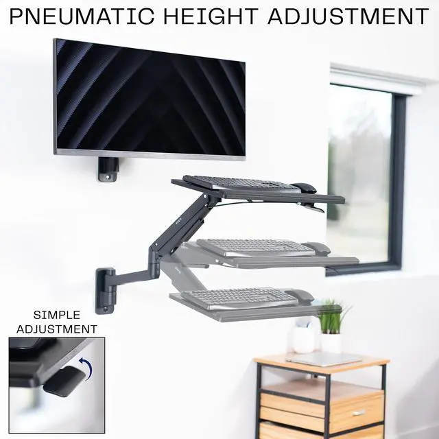 Create a flexible floating workstation with the Black Pneumatic Wall Mounted Keyboard Tray (MOUNT-KB35C) from VIVO! Designed to make your workstation more comfortable and ergonomic, this floating keyboard tray provides adjustable tilt, swivel, and height for a personalized typing experience. Instead of being stuck in an uncomfortable position all day with poor posture, our wall-mounted station lets you easily switch to any position with its durable counterbalance adjustability. Built-in pneumatic spring assist makes height adjustments possible at the touch of a hand, and the locking mechanism will hold your desired setting securely in place. Combine this product with a monitor wall mount (sold separately) to create a completely customizable floating wall setup.
