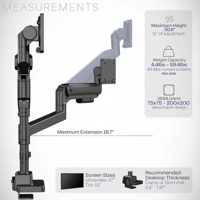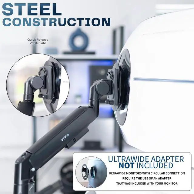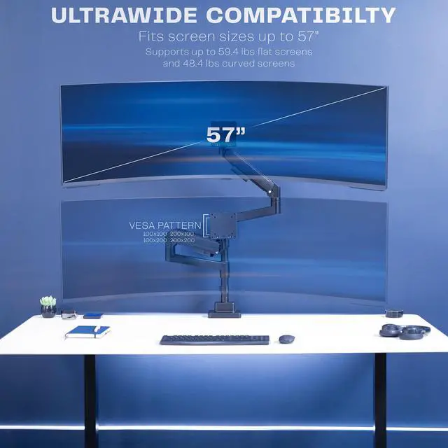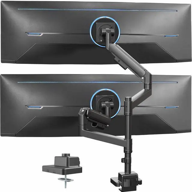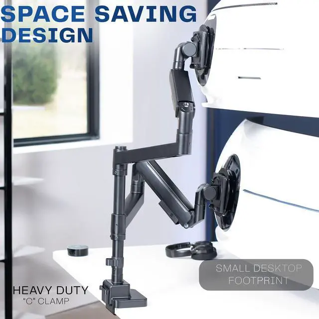 Save desk space and enhance your work or gaming experience with the Pneumatic Arm Dual Ultrawide Monitor Desk Mount (STAND-GT57T2) from VIVO! The ultimate ultra-wide mount designed for monitors and TVs, this heavy-duty stand perfectly counterbalances the weight of your 24 to 57 screens (up to 59.4 lbs) for optimal ergonomic positioning. Featuring steel construction, flexible joints, screen articulation, counterbalance height adjustment, a sturdy desk clamp and grommet mount (with optional reinforcement plate), and more, this dual monitor arm with pole is ready to transform your workspace. All hardware and instructions are provided for assembly, so you can get your stand secured and ultra wides mounted in no time!