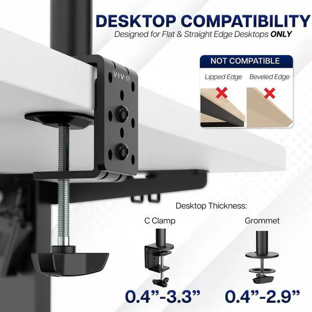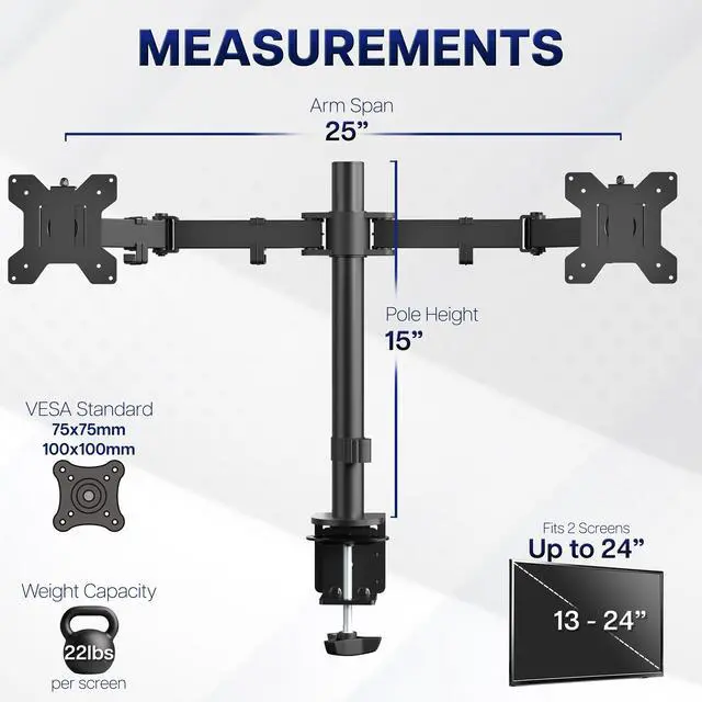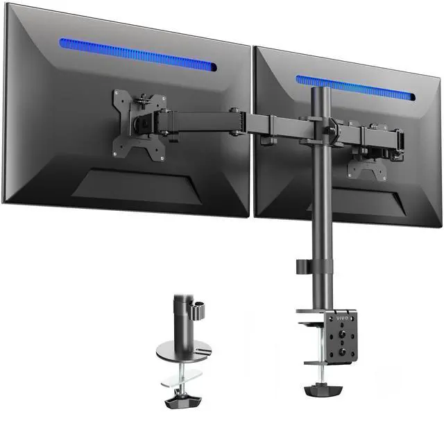 Enjoy double the viewing with the Dual Monitor Desk Mount (STAND-V024) from VIVO! Made of high-grade steel and aluminum, this stand fits most screens up to 24 in size and supports up to 22 lbs per monitor. Every joint can be tightened to adjust exactly how fluid/stationary you want everything to be. Special features include the ability for each VESA plate to be adjusted up and down by 0.5 so your monitors will be perfectly aligned. We also make mounting your screens easy with detachable VESA plates that screw into your monitors and then slide back onto the frame of the stand. Heavy duty C-clamp and grommet mounting options are included. All hardware and instructions are provided so you can get your new stand assembled and providing comfortable viewing angles in no time!