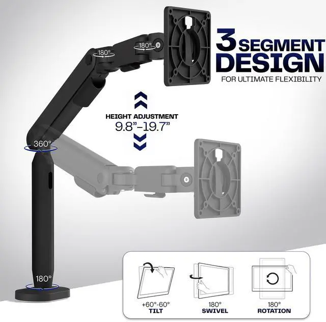 Elevate your screen to a comfortable viewing height with the Flexible Mechanical Arm Single Ultrawide Monitor Desk Mount (STAND-V10PH) from VIVO! This monitor arm perfectly counterbalances the weight of your 17 to 35 screen (up to 24.2 lbs) for optimal ergonomic positioning. Featuring lightweight aluminum construction, a wide range of flexible movement, screen articulation, tension spring height adjustment, a sturdy desk clamp and grommet mount, integrated cable management, and more, this VESA monitor stand is ready to transform your workspace. All hardware and instructions are provided for easy assembly, so you can get your stand secured and ultra wide mounted in no time!