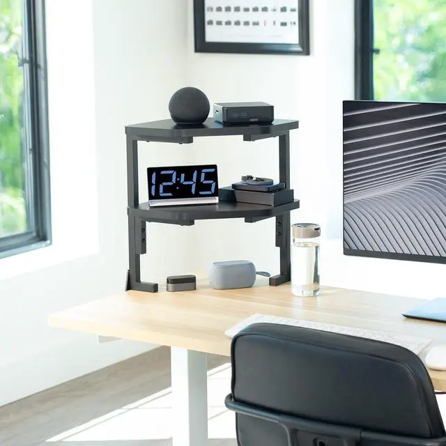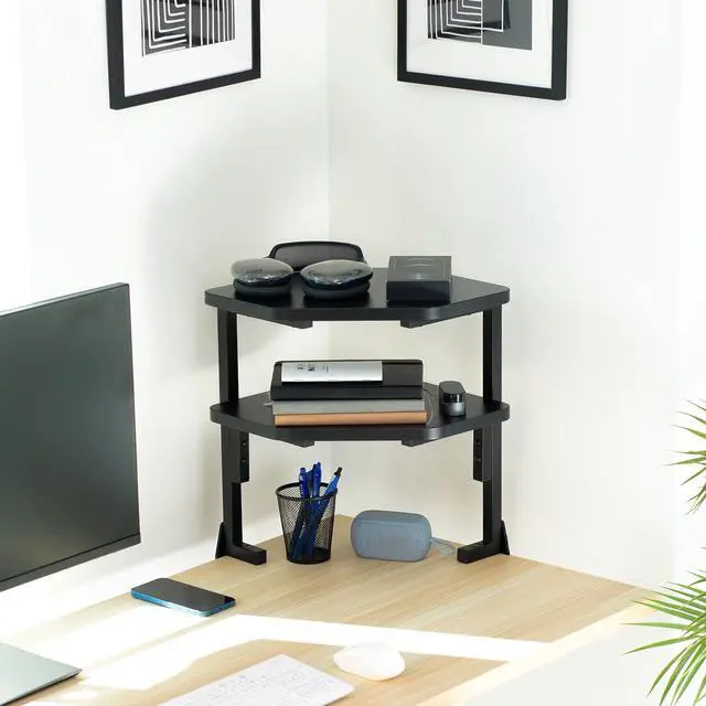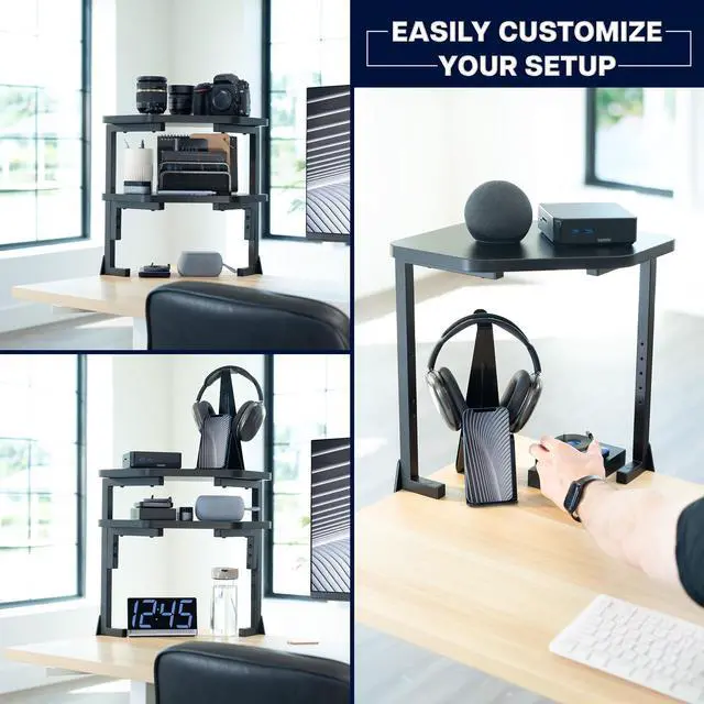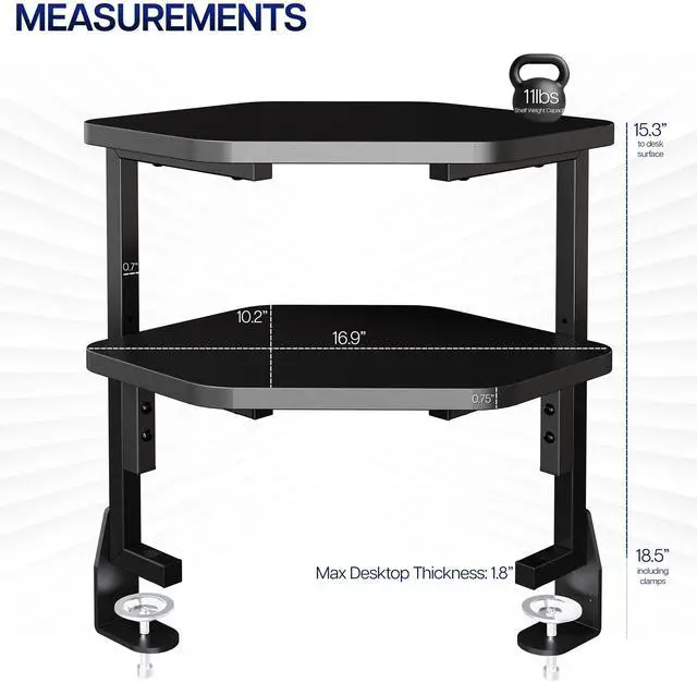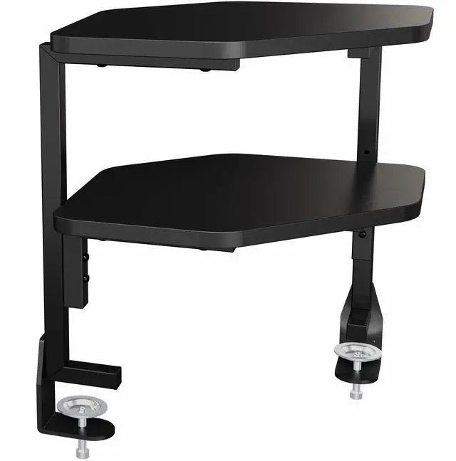 Add additional storage to your corner desk with the Above/Below Corner Clamp-on 17" Dual Shelf (STAND-SHELF2CR) from VIVO! Featuring 16.9 x 10.2 shelves, this clamp-on dual platform reduces desktop clutter with space for gaming accessories, office supplies, hard drives, decor, notebooks, and more. The shelving unit stands 16.1 tall, holding up to 11 lbs per shelf. Reversible clamp design allows the rack to be mounted above or below the table top for a customized setup. The secure C-clamps anchor to a 90-degree corner desktop, providing a solid surface that raises and lowers with your desk.