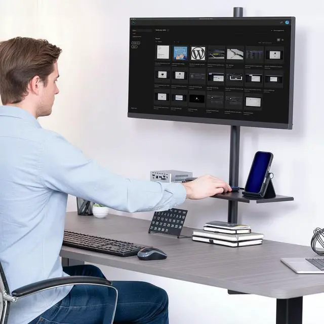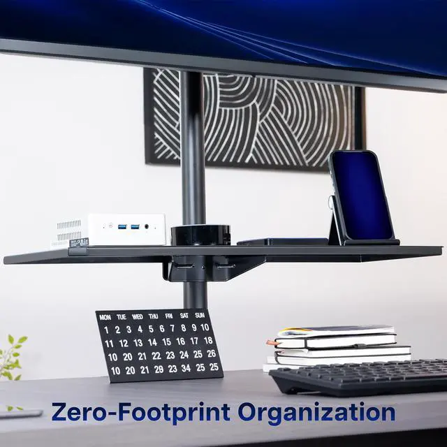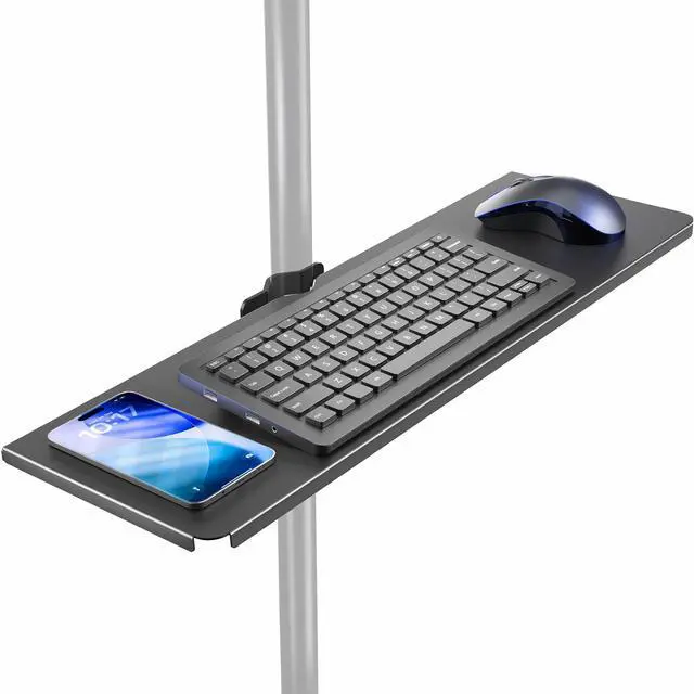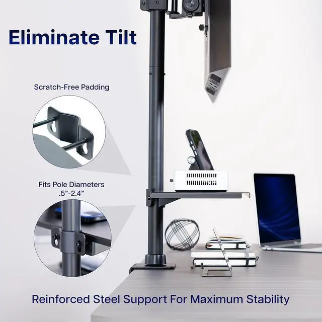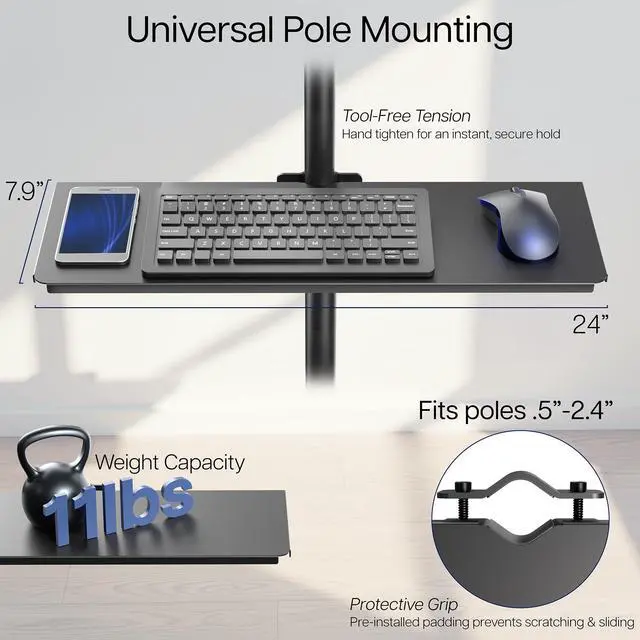 Maximize storage space by keeping your items in a convenient location with Clamp-on 24" Shelf Pole Mount (MOUNT-SF24P) from VIVO! This sturdy platform attaches to tubing from 0.5 to 2.4 in diameter, allowing it to fit a variety of microphone, TV, speaker stands, and more! The adjustable clamp makes installation a simple process, and solid steel design ensures sturdy support for your items. This shelf holds anything from electronic devices to writing utensils, coffee mugs, and other frequently used items that you want to place on this space-saving display.