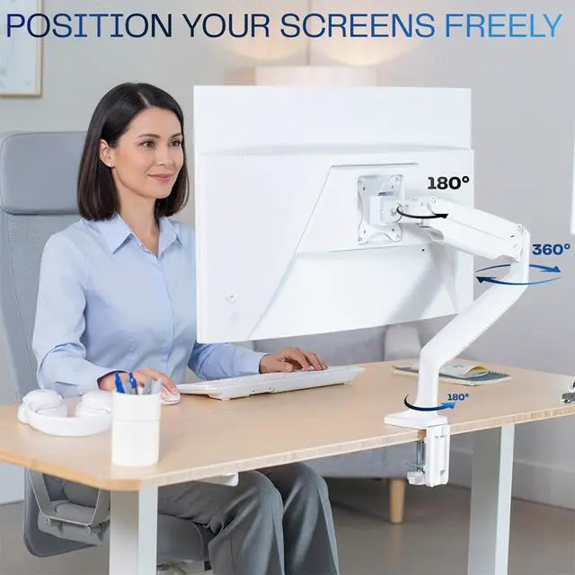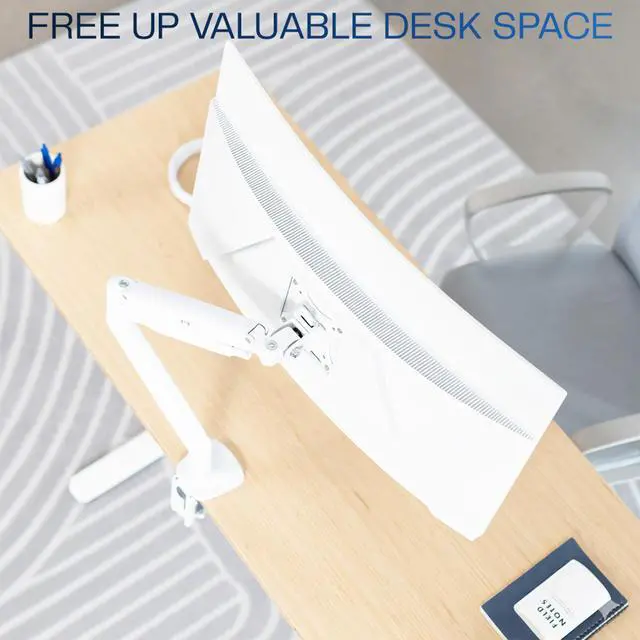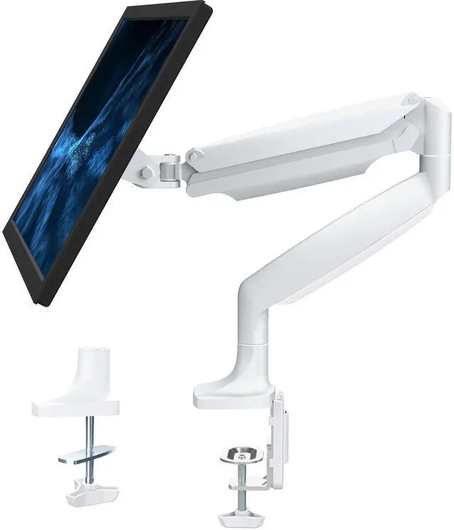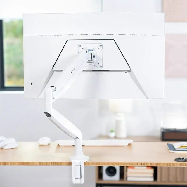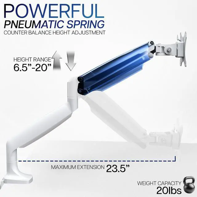 Elevate your monitor to an ergonomic height with the White Pneumatic Arm Single Monitor Desk Mount (STAND-V001QW) from VIVO! Featuring high-quality aluminum construction, flexible joints, smooth height adjustment, a sturdy desk clamp and grommet mount, integrated cable management, and more, this stand is ready to transform your workspace! The pneumatic spring creates a perfect counterbalance presentation in all directions for monitors up to 32" in size and between 2.2 lbs and 20 lbs in weight. The adjustable mounting bracket provides screen articulation that reduces glare and creates comfortable viewing angles throughout your entire workday.
