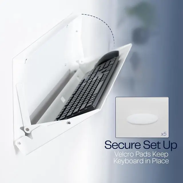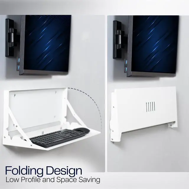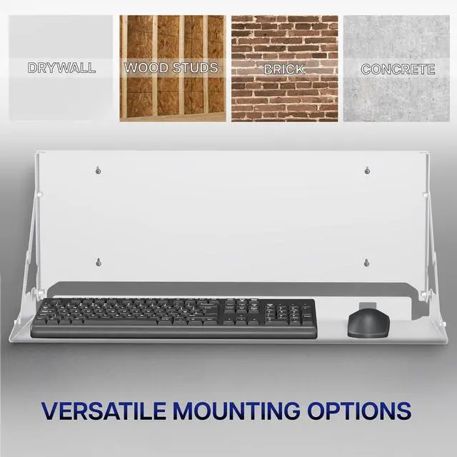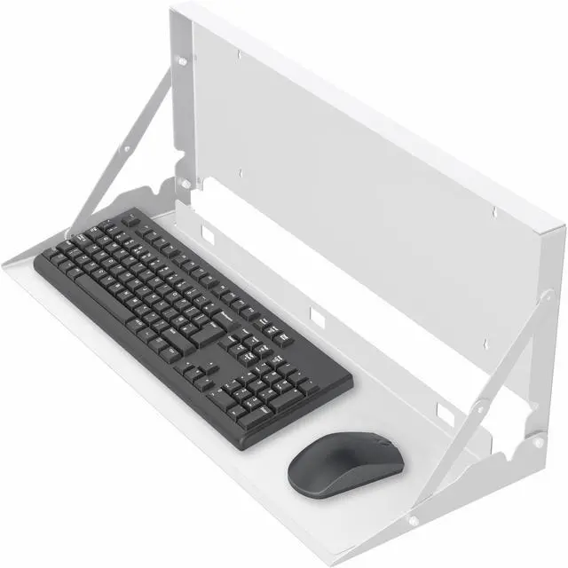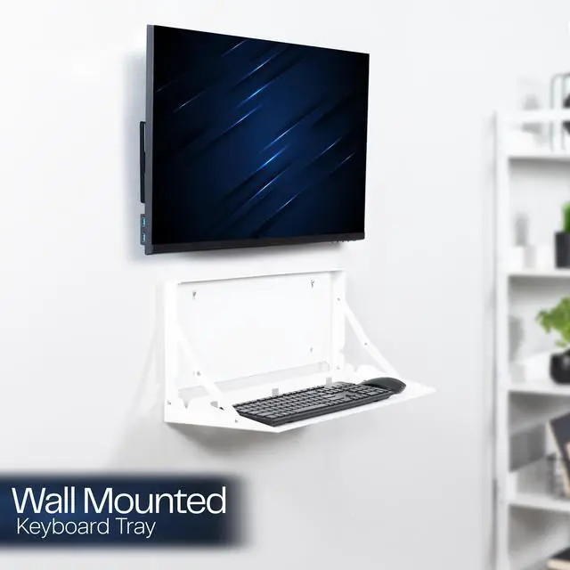 Create a floating workspace with the White Flip Down Keyboard Tray Wall Mount (MOUNT-FDKB1-W) from VIVO! The ideal component for standing workstations, this typing platform is designed for wall mounting under a monitor screen. Sturdy steel material holds your full-size keyboard and mouse securely in place with velcro padding for added stability. The folding design makes this product space-efficient, which is needed in small offices and healthcare facilities. When you are done using this tray, simply fold it back up into the wall mount until next time.