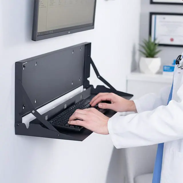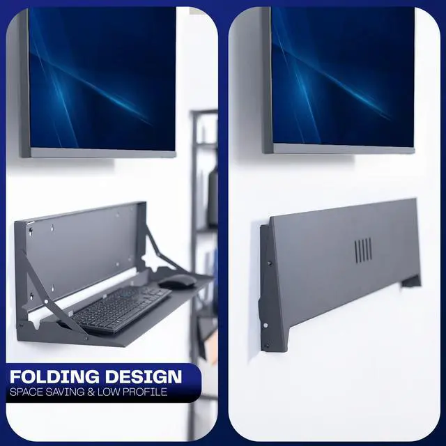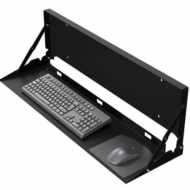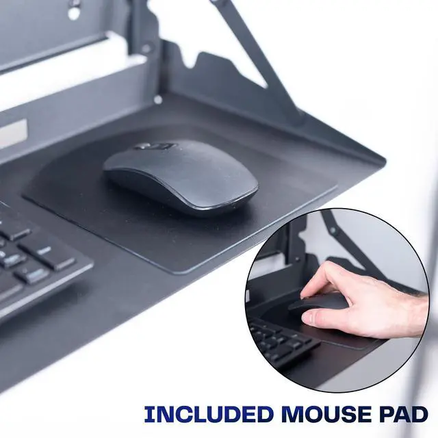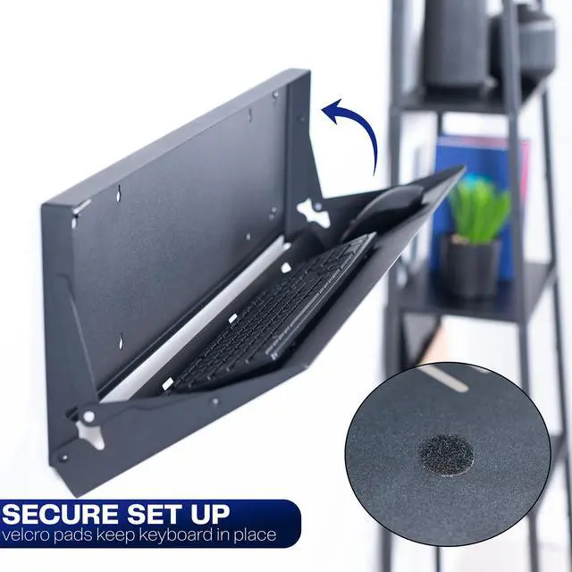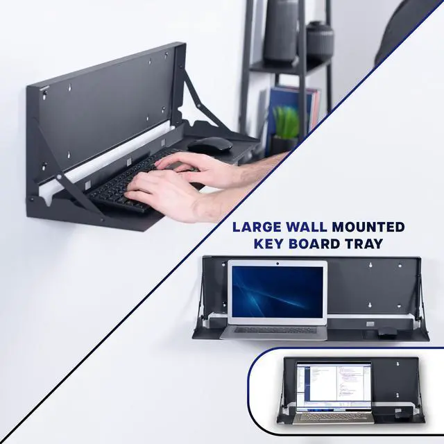 Create a floating workspace with the Black Flip Down Keyboard Tray Wall Mount (MOUNT-FDKB30) from VIVO! The ideal component for standing workstations, this typing platform is designed for wall mounting under a monitor screen. Sturdy steel material holds your full-size keyboard and mouse securely in place with velcro padding for added stability. The folding design makes this product space-efficient, which is needed in small offices and healthcare facilities. When you are done using this tray, simply fold it back up into the wall mount until next time.