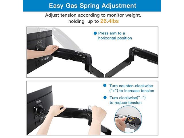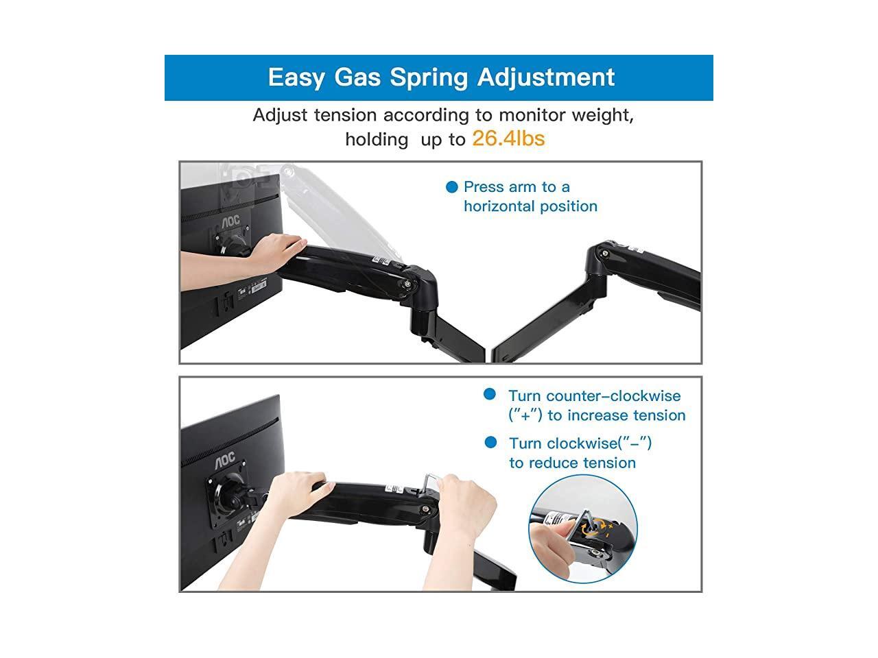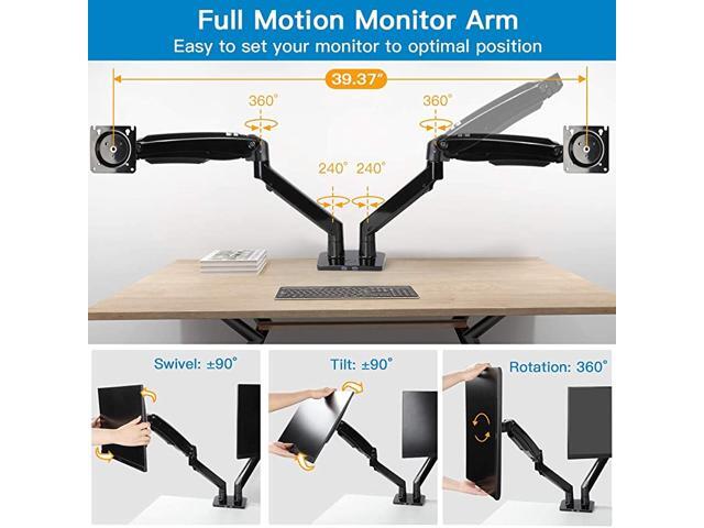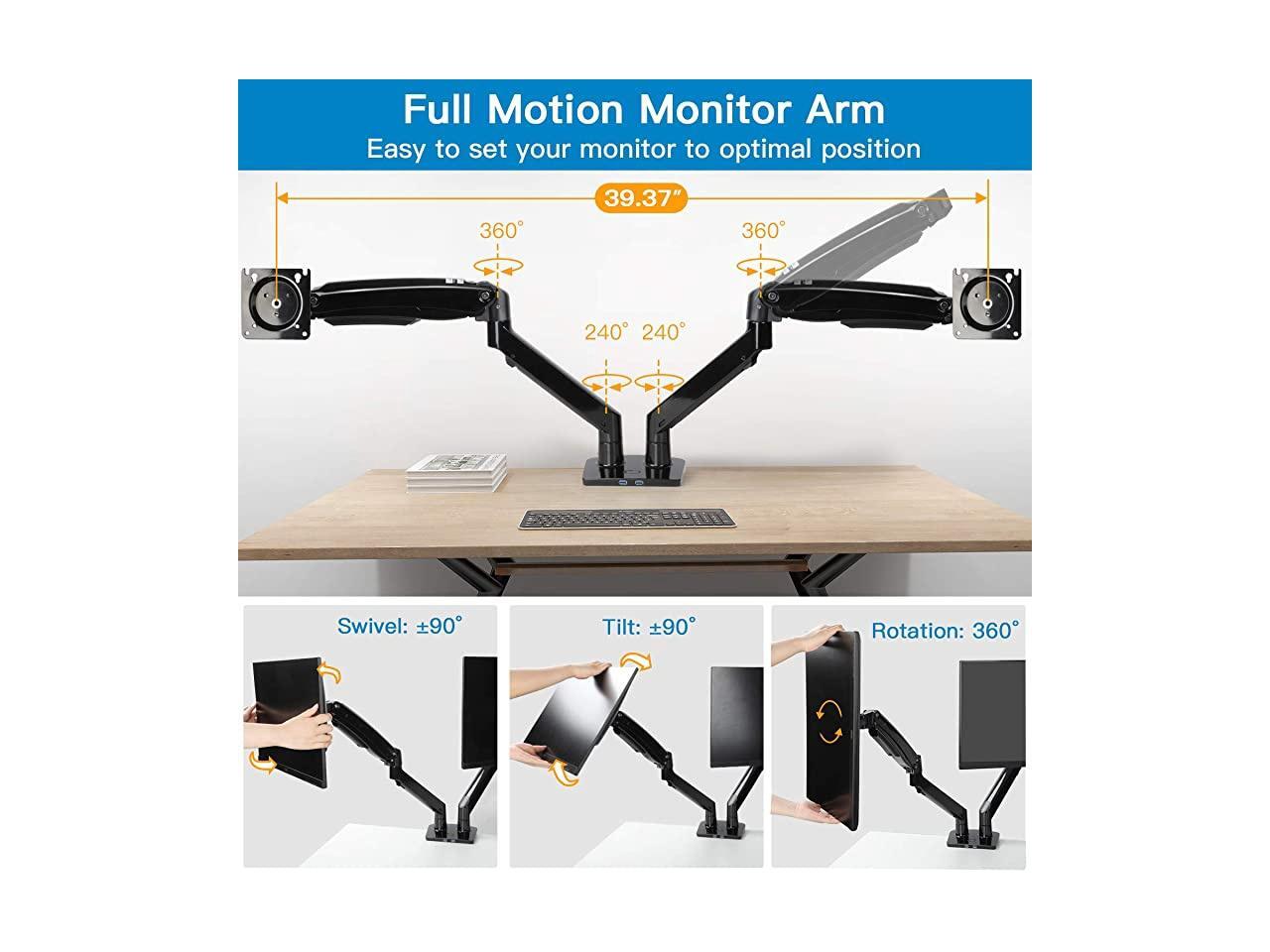- *****FULL MOTION ADJUSTMENTS - This gas spring dual monitor stand allows your screens to swivel from -90to +90, tilt from -55to +8and rotate 360. Conveniently set your monitors at an optimal angle to increase productivity and comfort