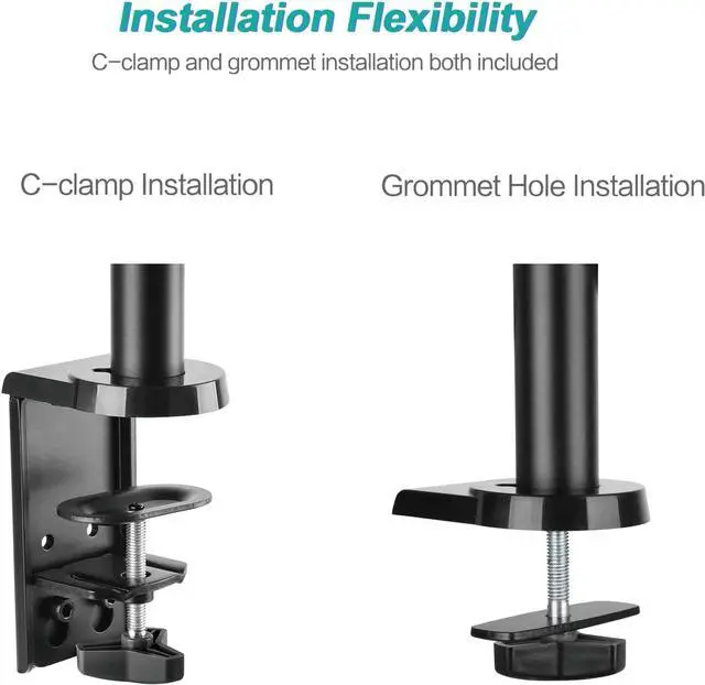 Please Check the Mount Compatible List: Screen Size: Up to 32” Weight Capacity: 17.6lbs per arm VESA Size: 75x75mm and 100x100mm Two Locking System: C-Clamp: Maximum support 3.1” thick desk Grommet-Base: Maximum support 2.75” diameter desktop cable grommet hole and 1.6” thick desk Mount Adjustment: +35° ~ -35° Tilt +90° ~ -90° Swivel 360° Rotate Max Height 23.62” Max Extension 18.34” Package Include: Dual Monitor Gas Spring Mount x 1 Mounting Hardware Kit User Manual