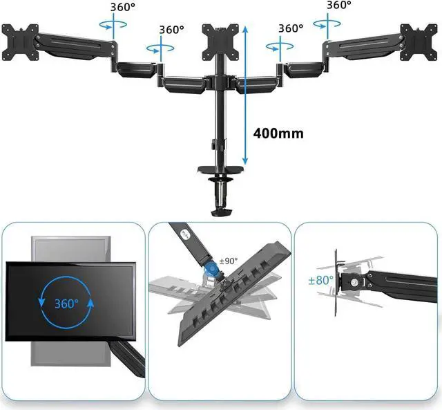 Full motion-The gas spring provides a smooth adjustment motion.Easy height adjustment, rotate 360°, tilt ±80° up and down, swivel ±180° left and right.