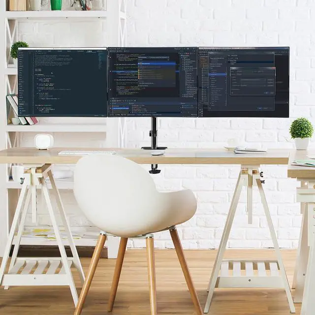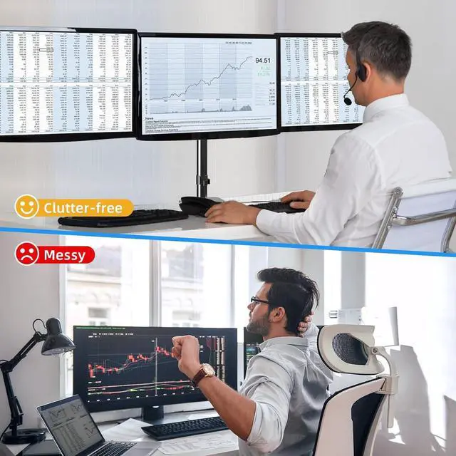 Ultimate Desk Space Saver: The 3 monitor stand mount get displays off your desk conveniently, and the standing pole design helping you to gain a ton of extra space. Integrated cable management to keep cables tucked in arm neatly, hide the sore eyes wire clutter.